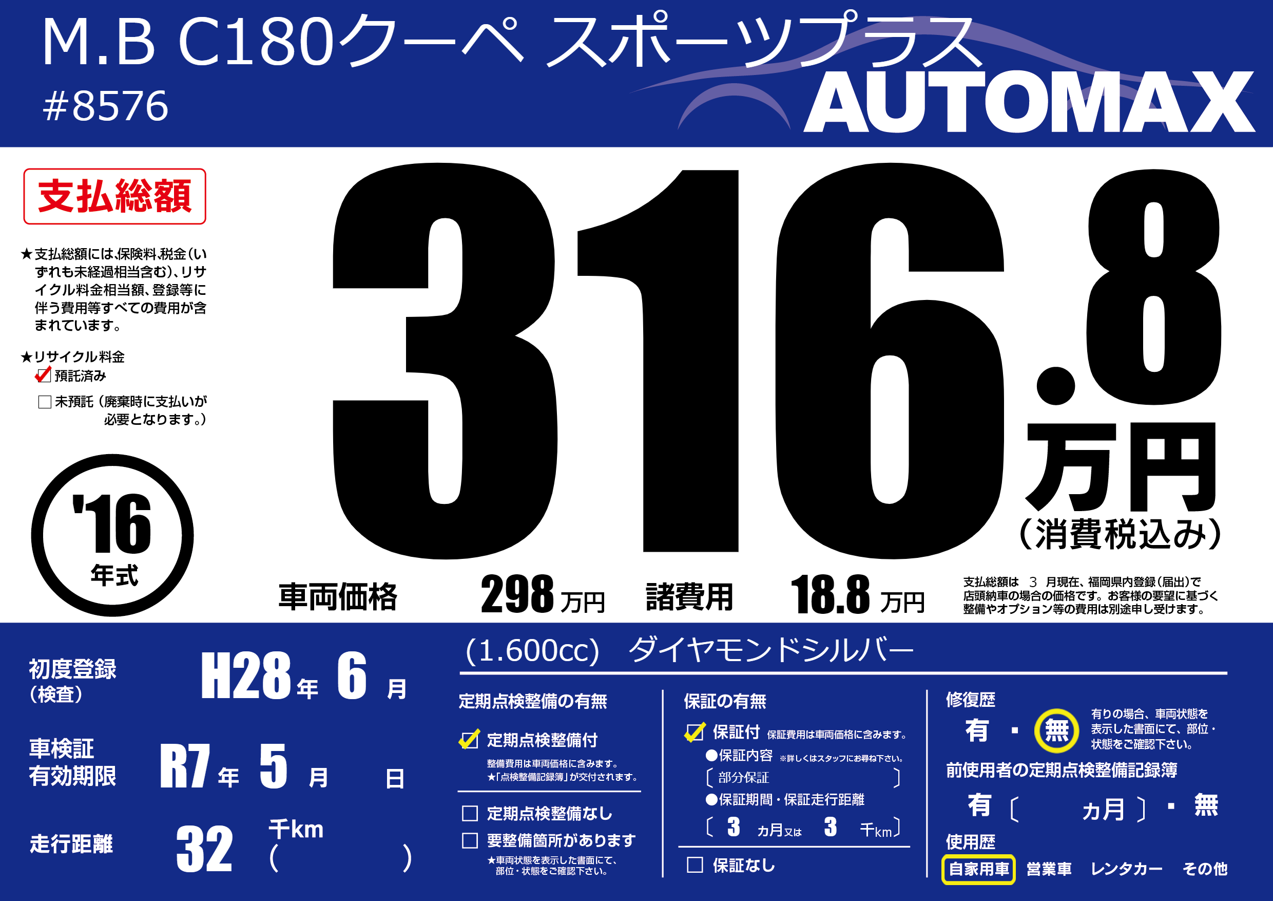 | 走行キロ | 3.2万km | 初年度登録 | H28年6月 |