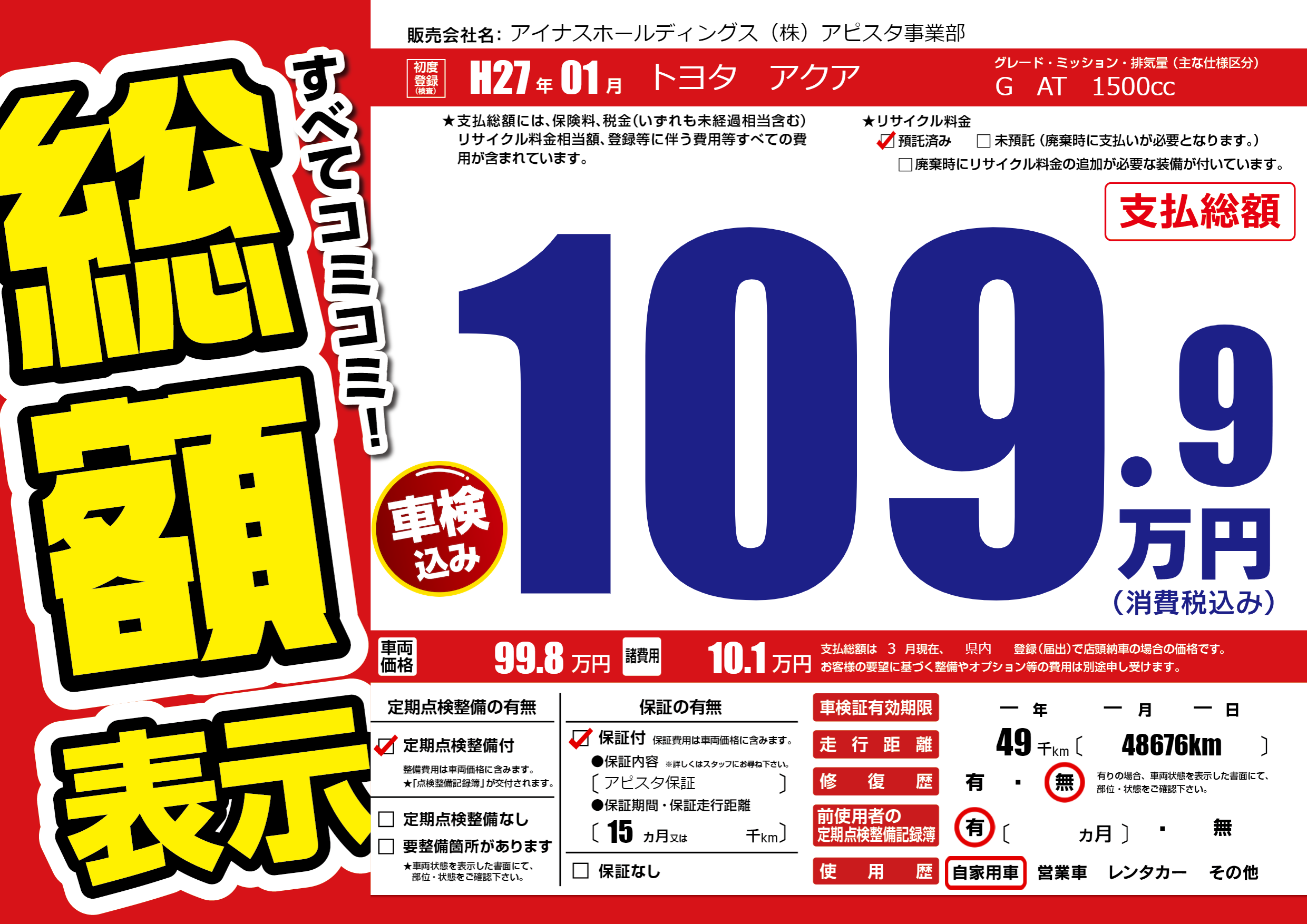 | 車名 | トヨタ アクア | グレード ミッション 排気量 |