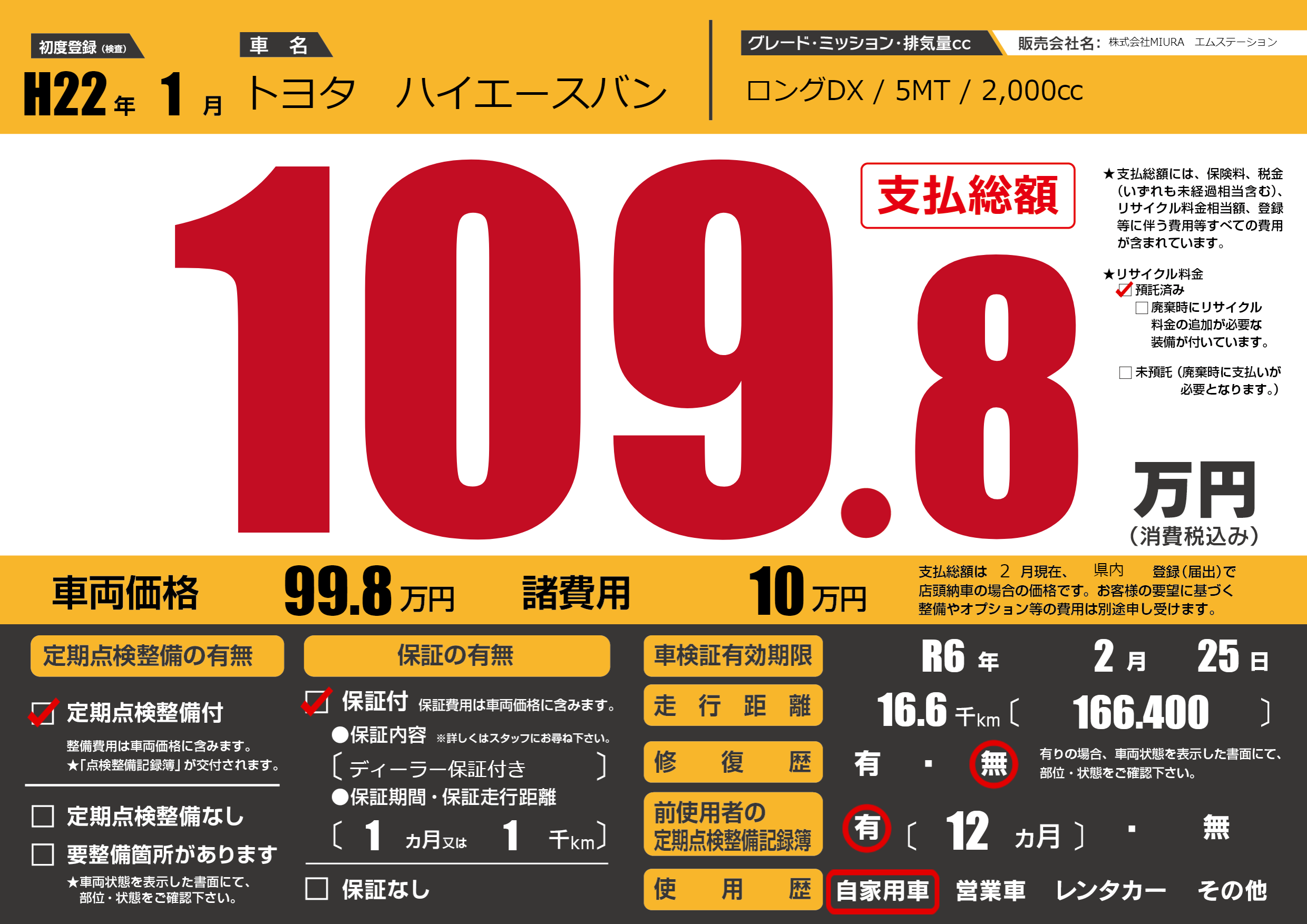 保証内容(ディーラー保証付き) 1ヶ月または1千km