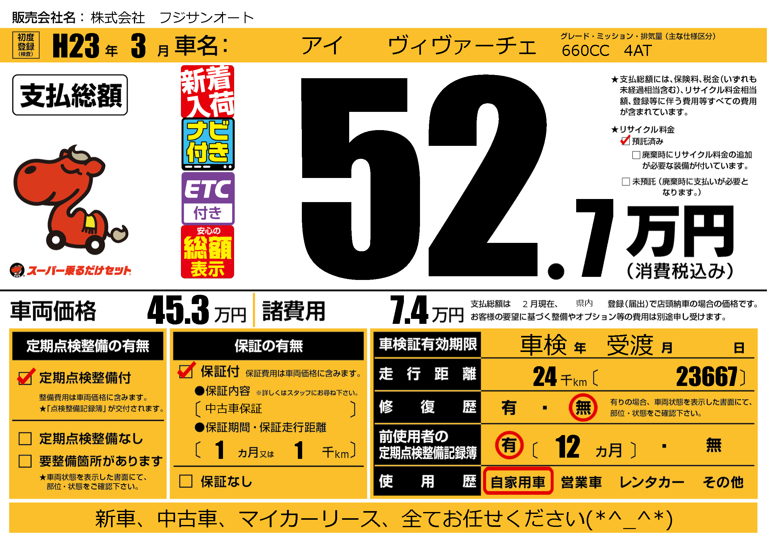 | 走行キロ | 2.4万km | 初年度登録 | H23年3月 |