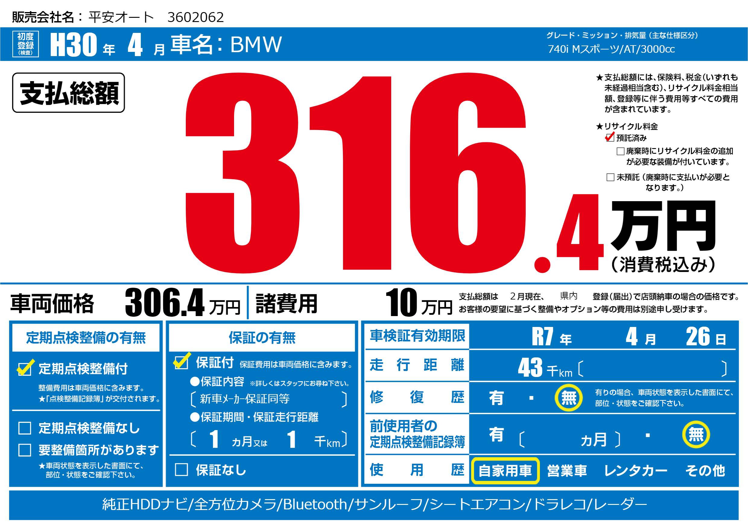 | 走行キロ | 4.3万km | 初年度登録 | H30年4月 |