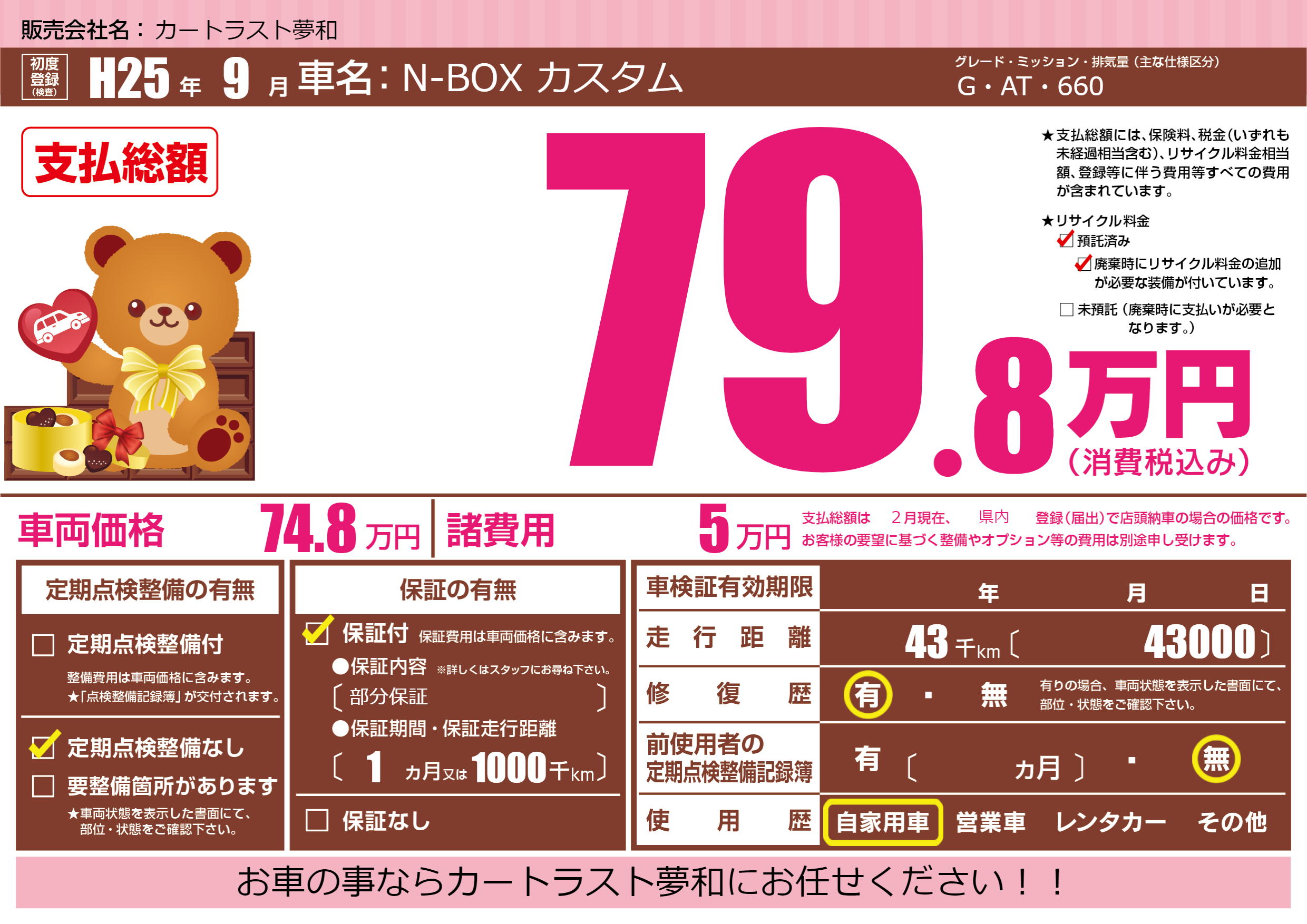 | 車名 | N-BOX カスタム | グレード ミッション 排気量 |
