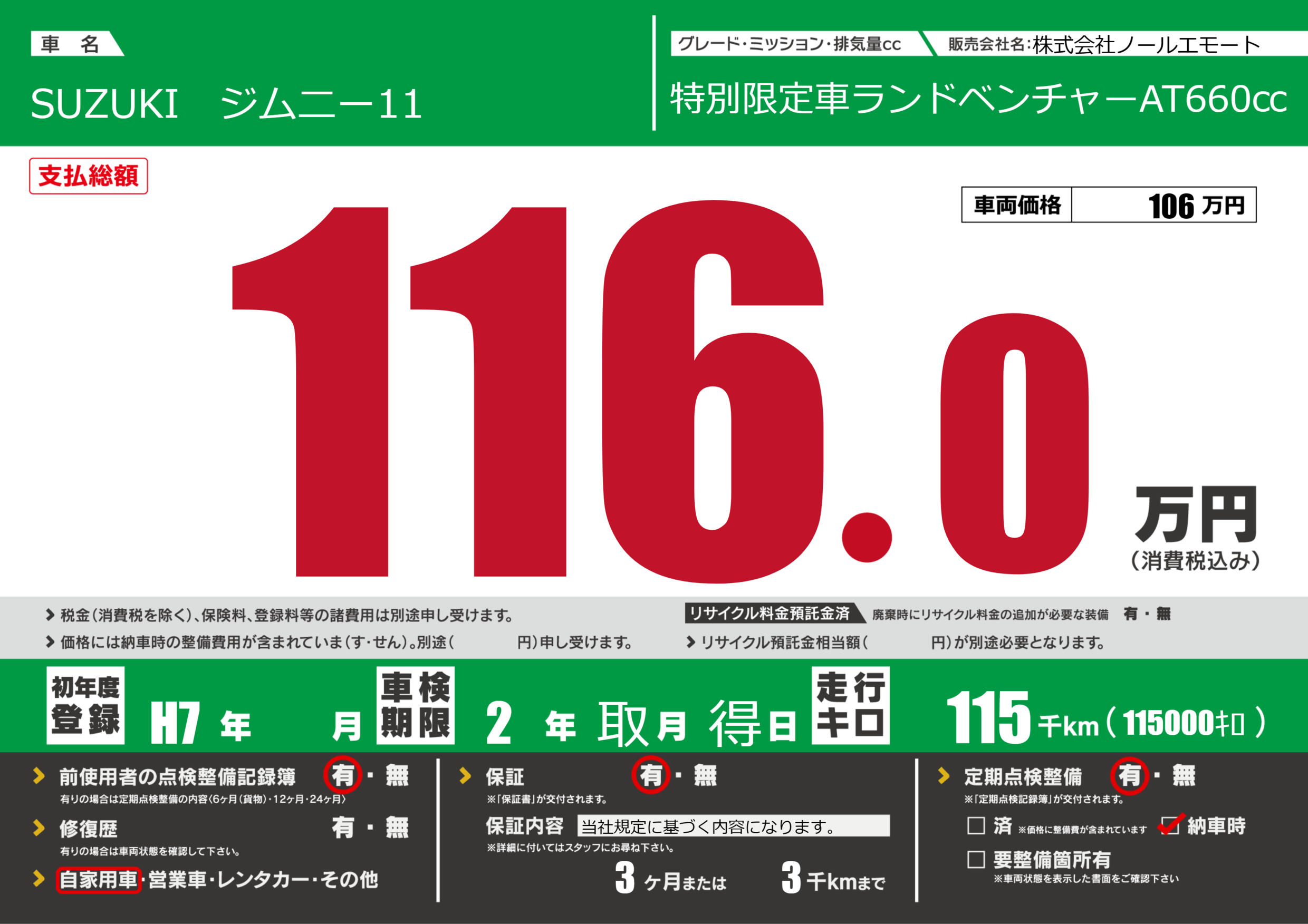 | 車名 | SUZUKI ジムニー11 | グレード ミッション 排気量 |