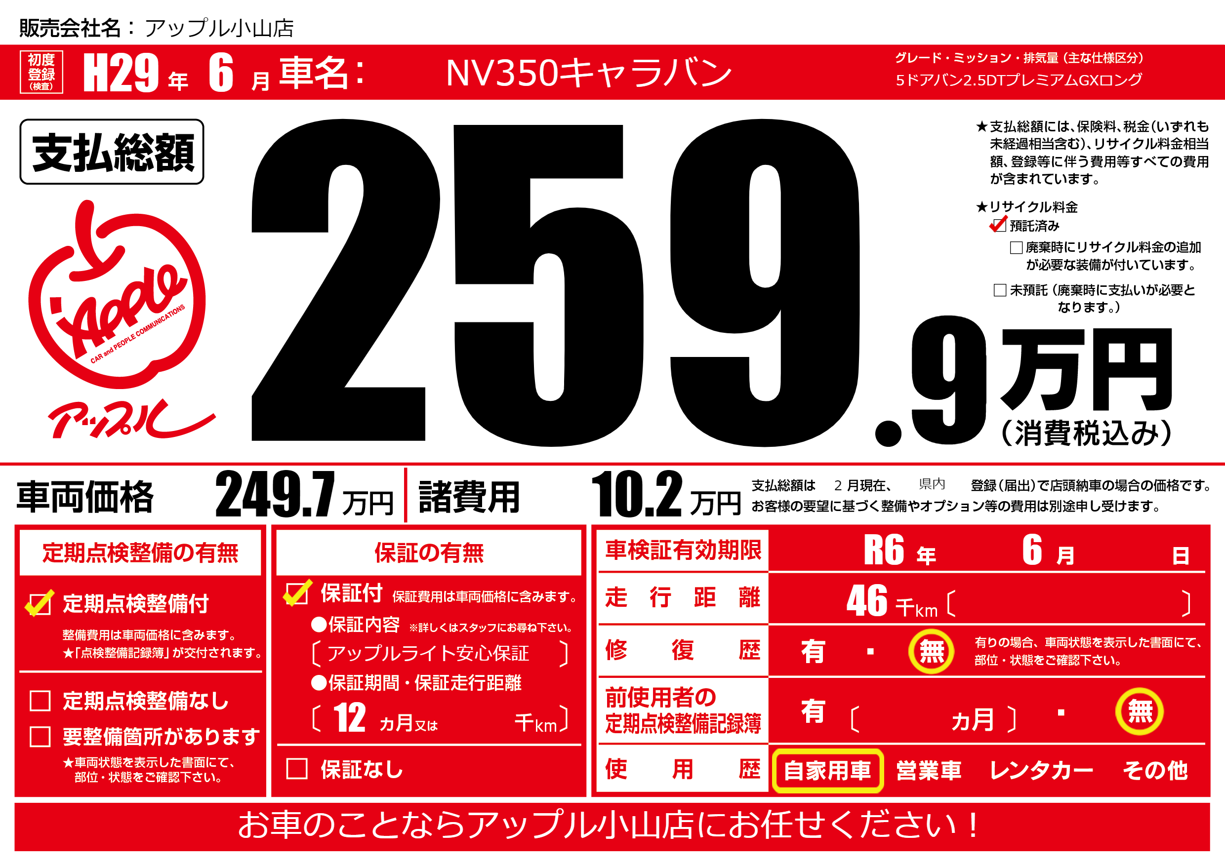 保証付き 保証内容(アップルライト安心保証) 12ヶ月または千km |
