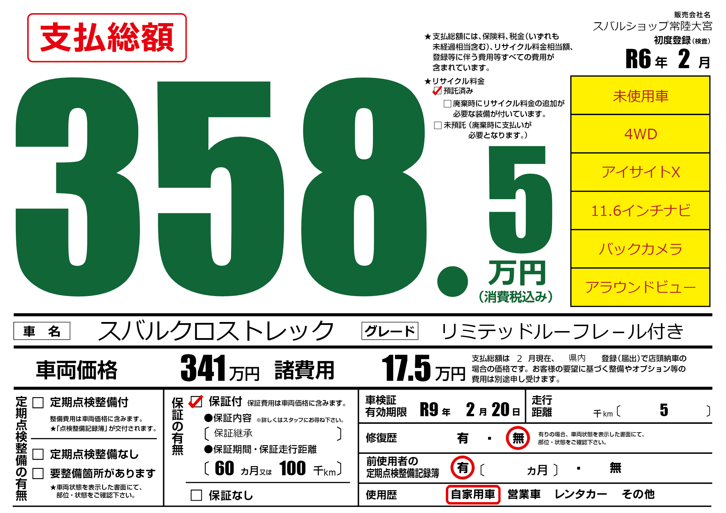 | 車名 | スバルクロストレック | グレード ミッション 排気量 |