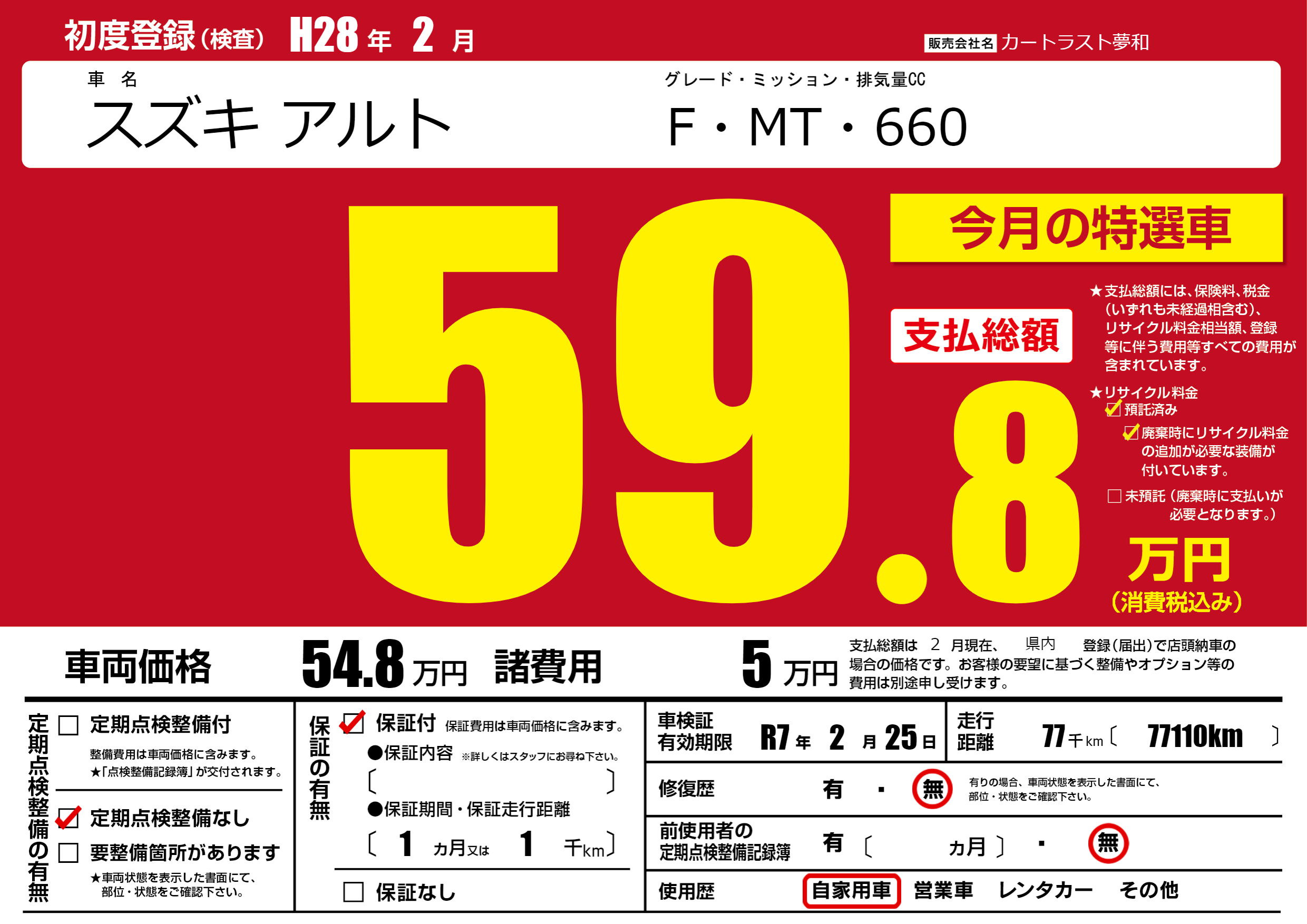 | 走行キロ | 7.7万km | 初年度登録 | H28年2月 |