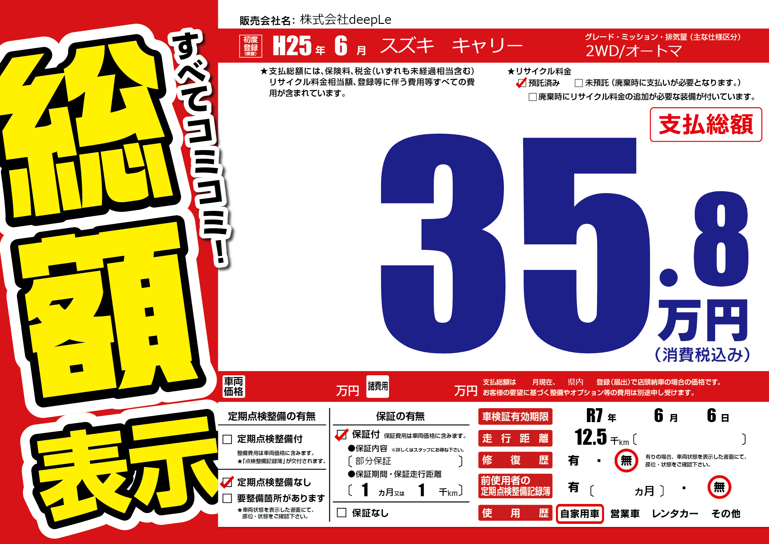| 走行キロ | 1.2万km | 初年度登録 | H25年6月 |