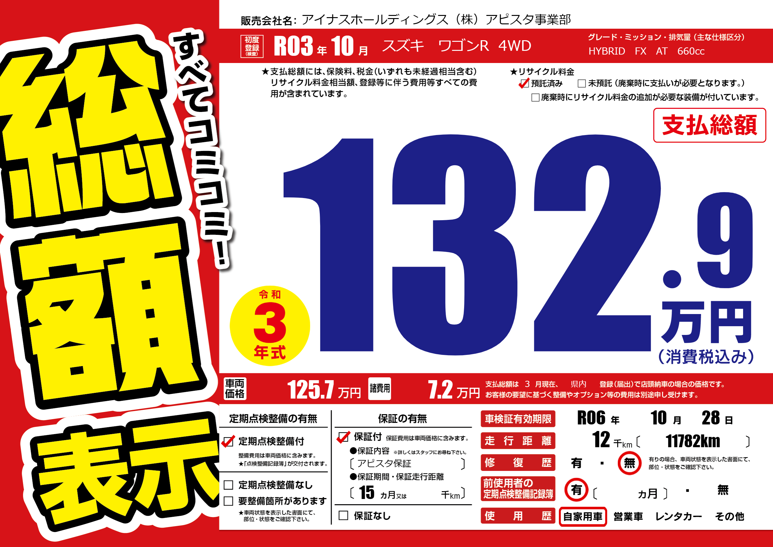 | 車名 | スズキ ワゴンR 4WD | グレード ミッション 排気量 |