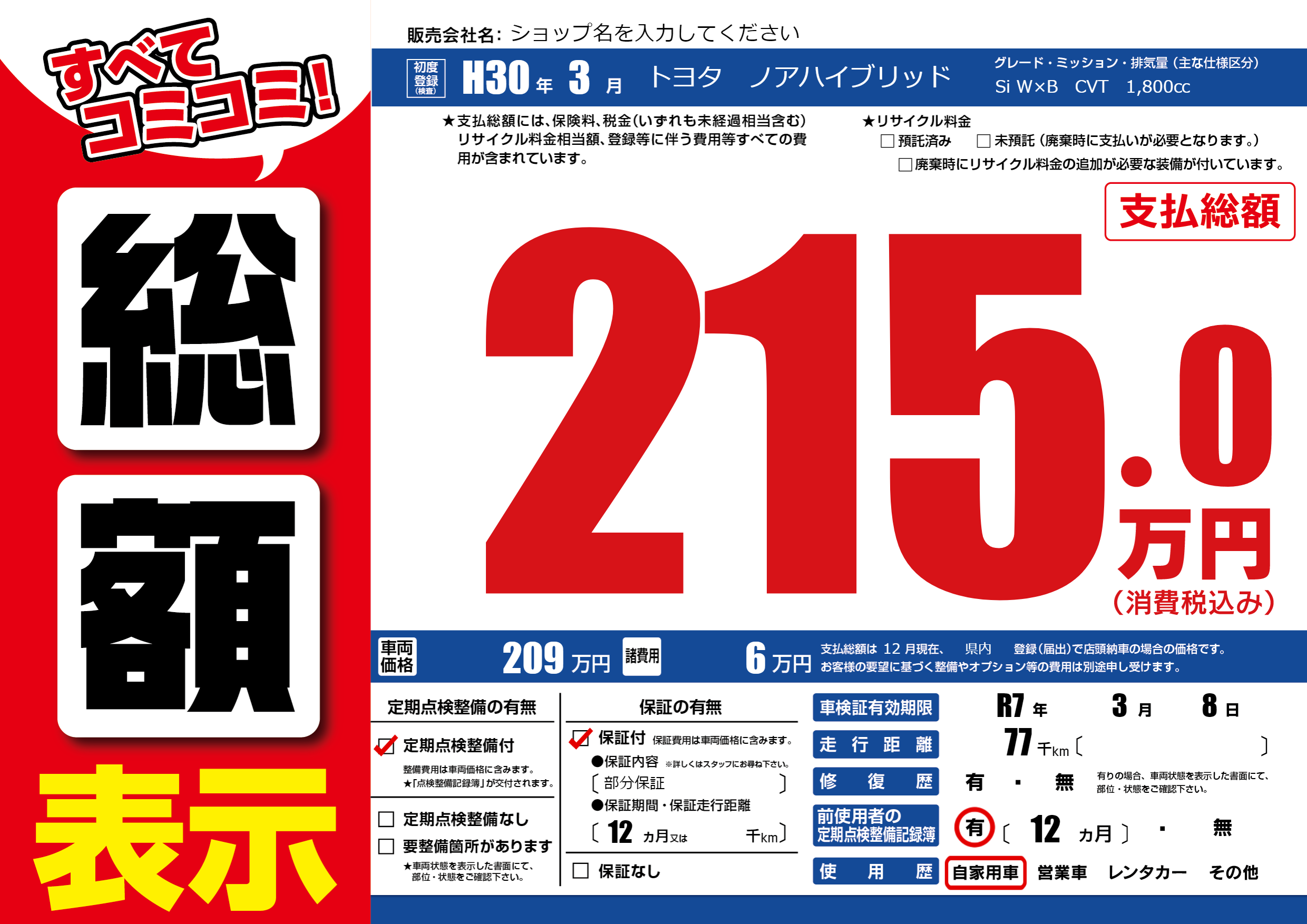 | 車名 | トヨタ ノアハイブリッド | グレード ミッション 排気量 |