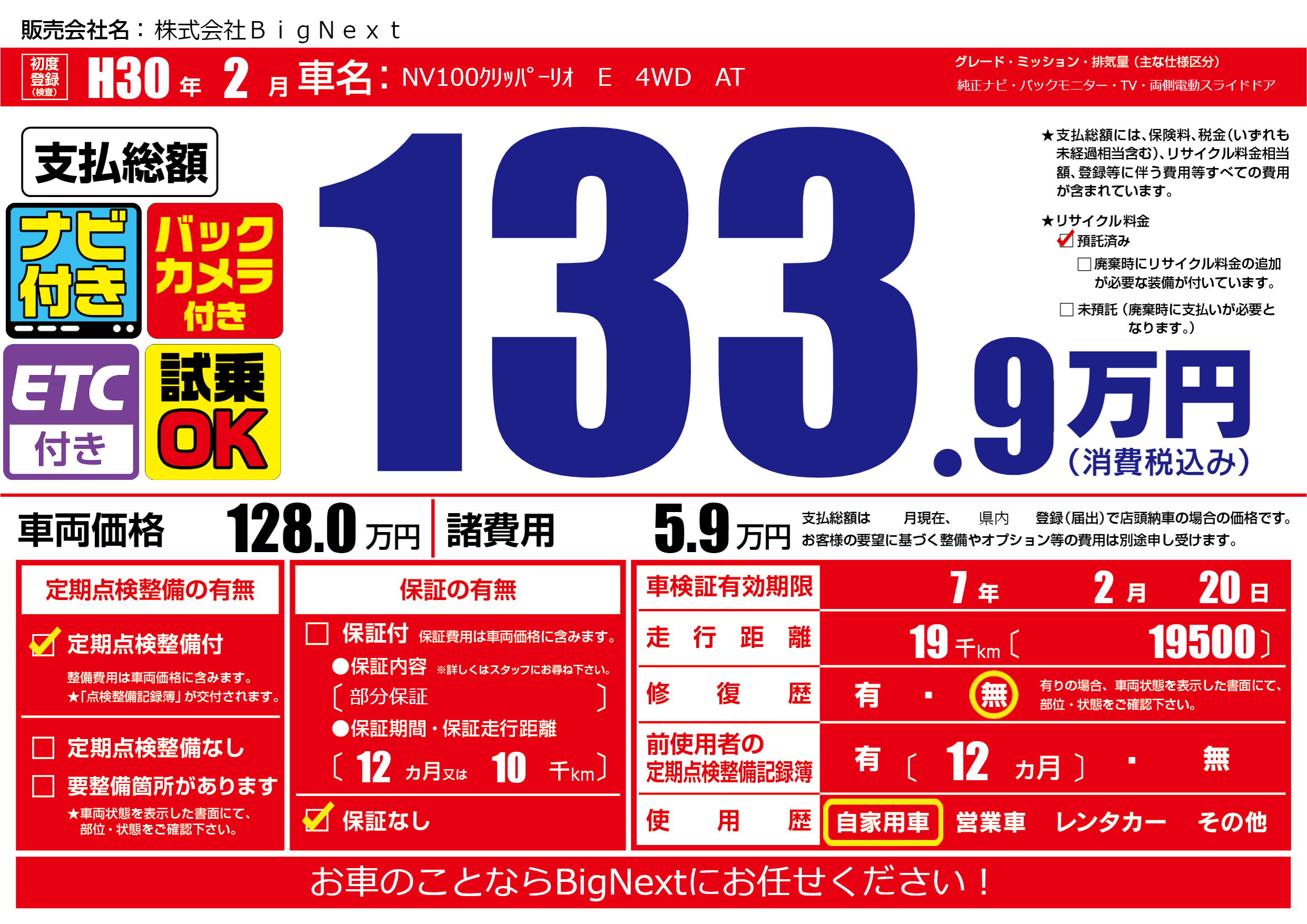 | 走行キロ | 1.9万km | 初年度登録 | H30年2月 |