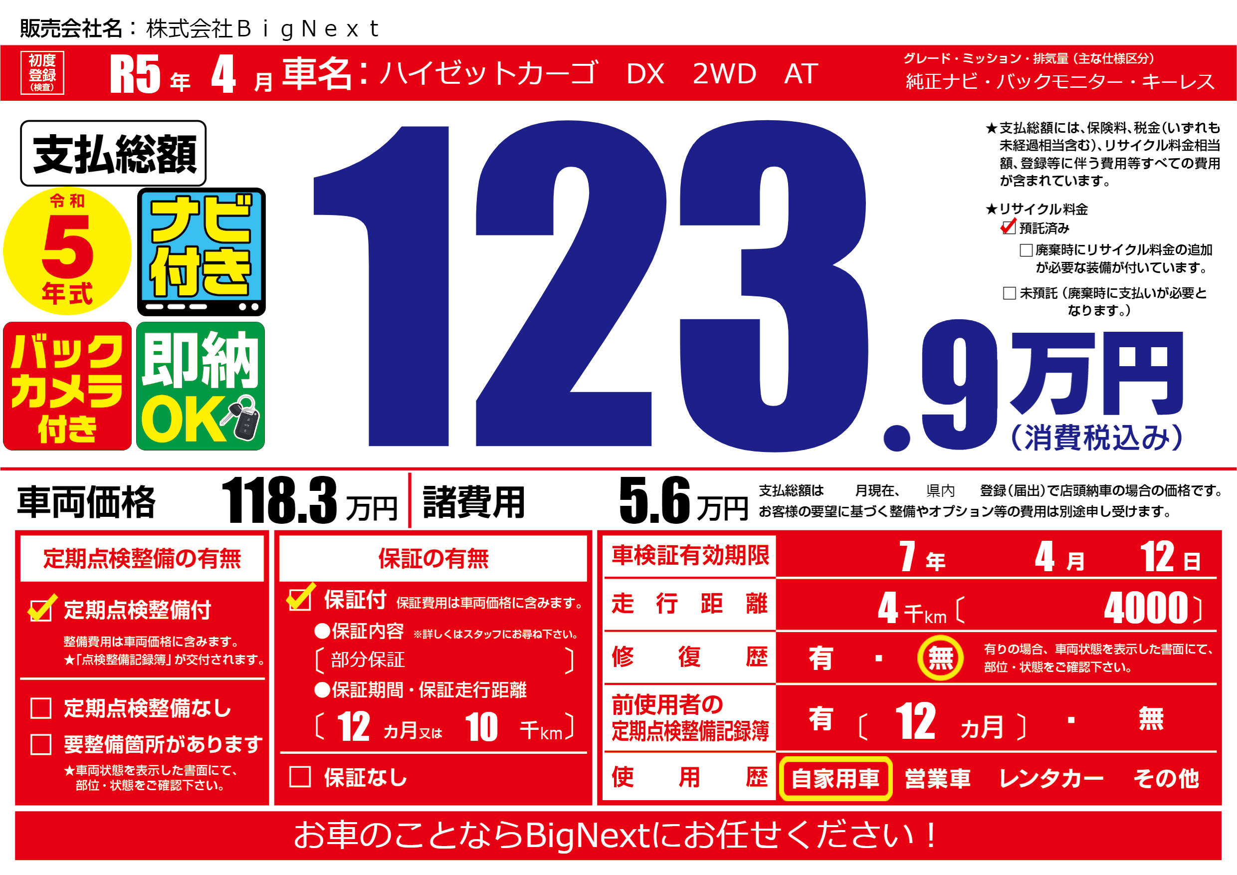 | 走行キロ | 0.4万km | 初年度登録 | R5年4月 |