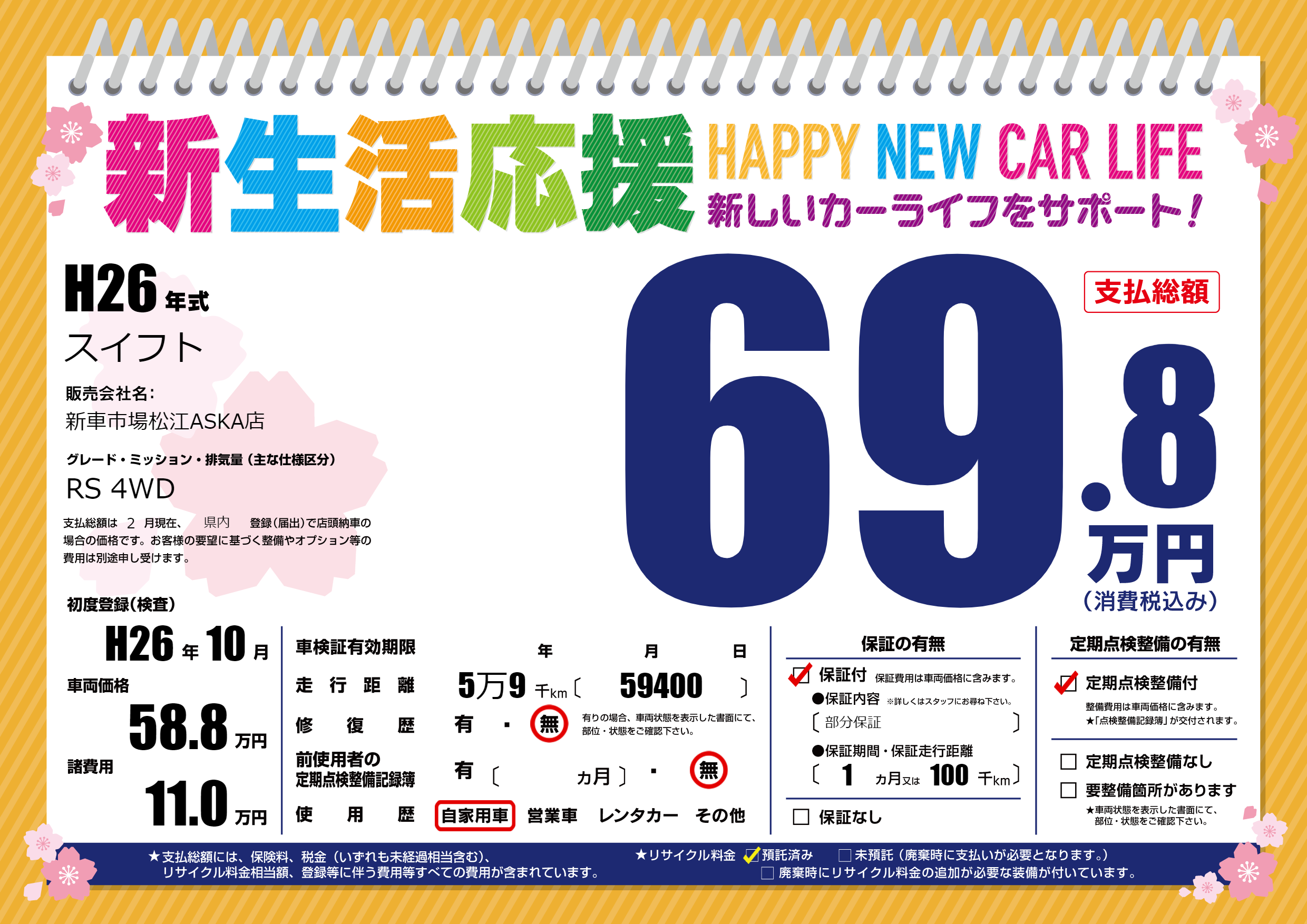 | 車名 | スイフト | グレード ミッション 排気量 |