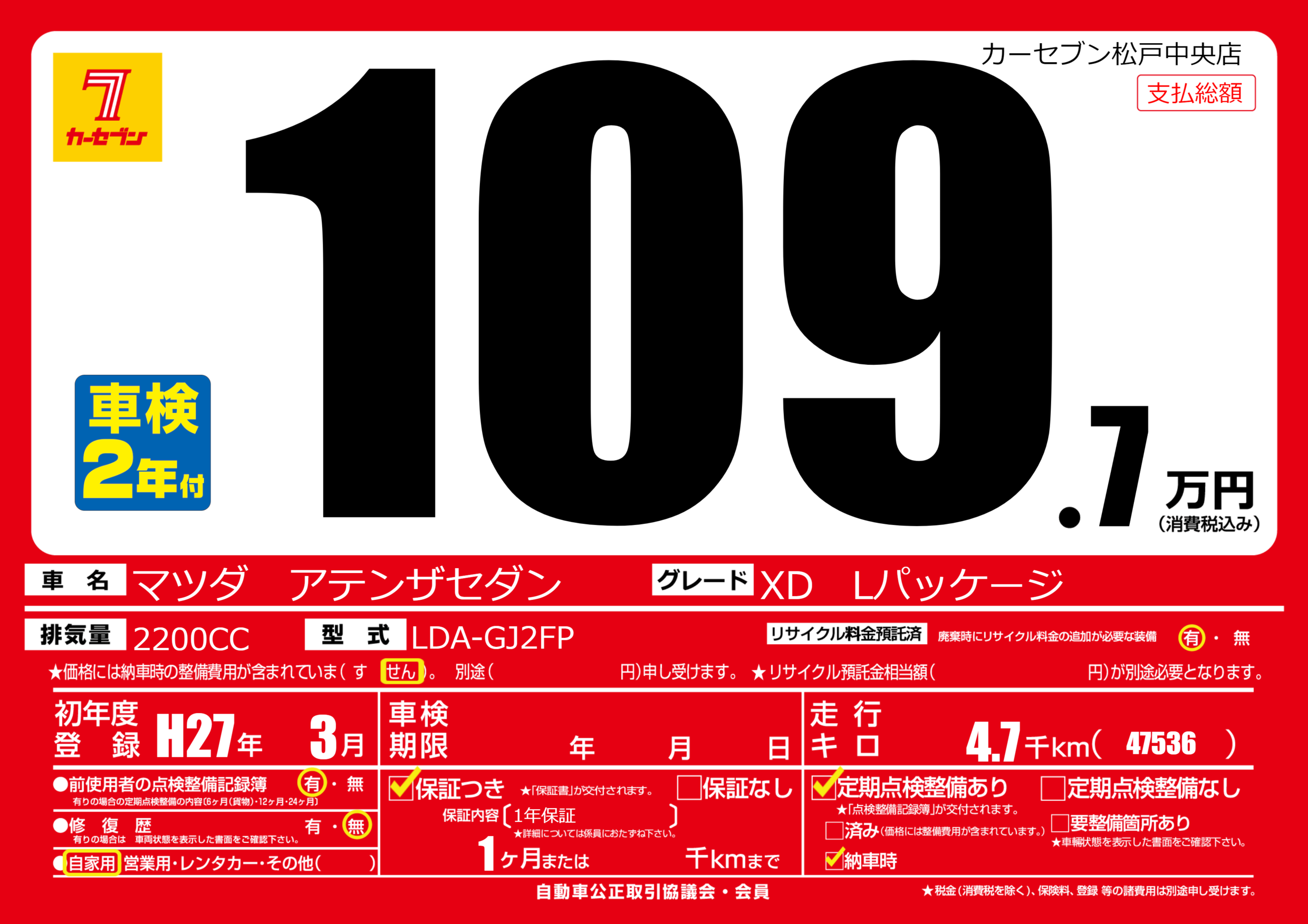 | 車名 | マツダ アテンザセダン | グレード ミッション 排気量 |