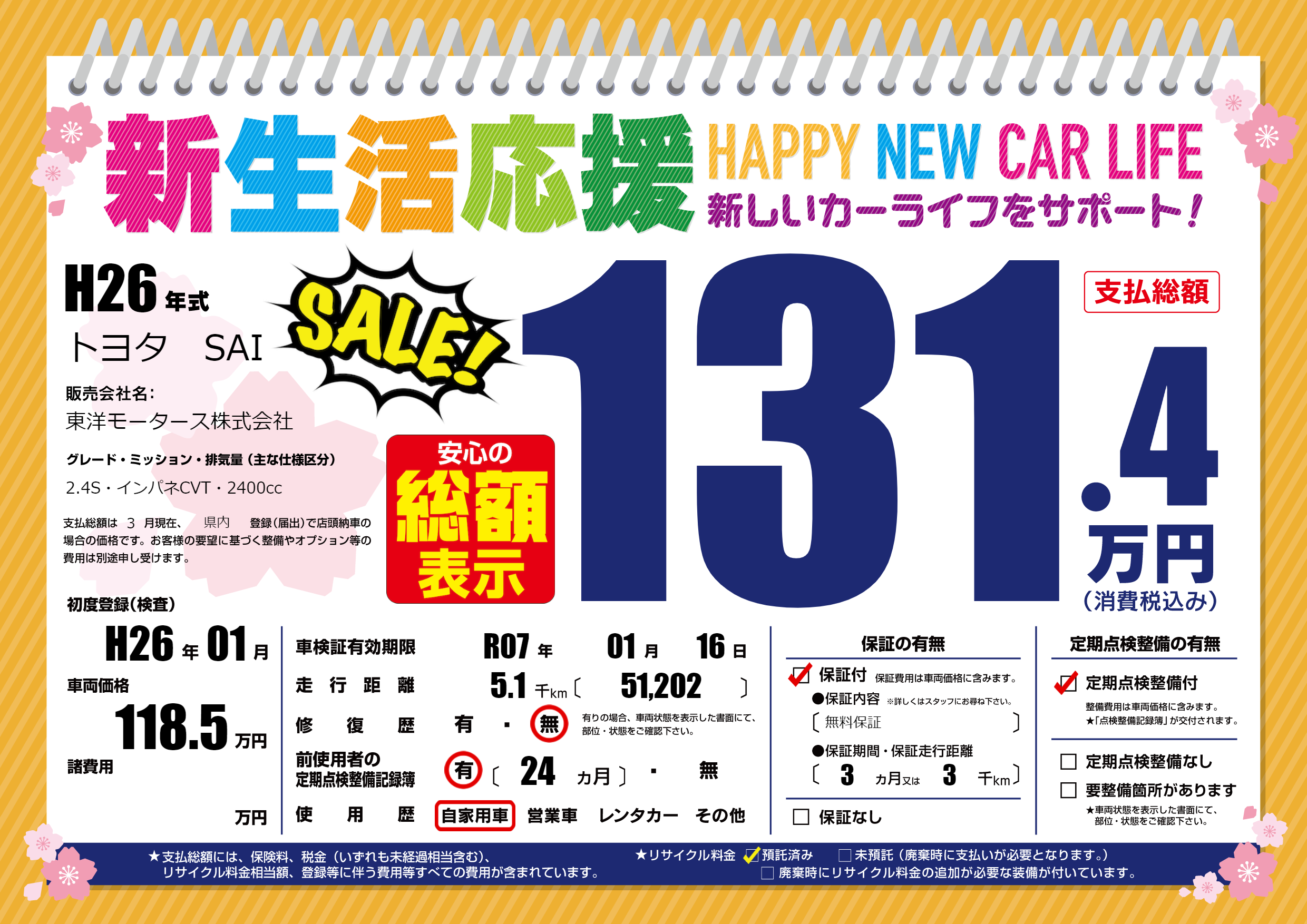 | 車名 | トヨタ SAI | グレード ミッション 排気量 |