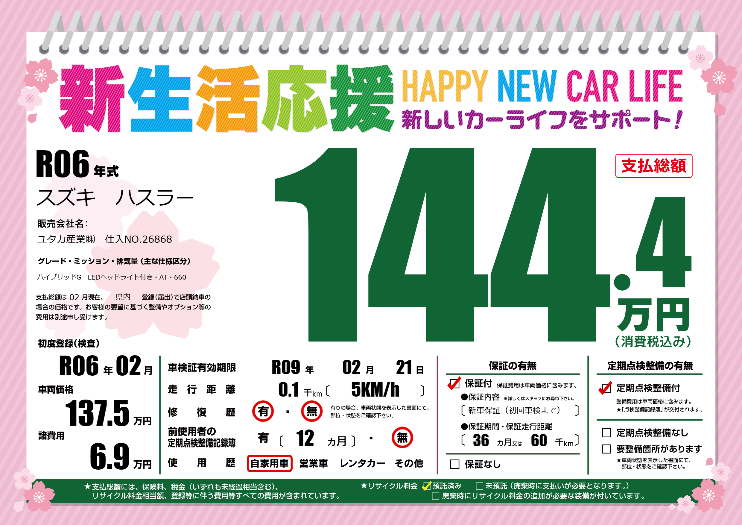 | 車名 | スズキ ハスラー | グレード ミッション 排気量 |