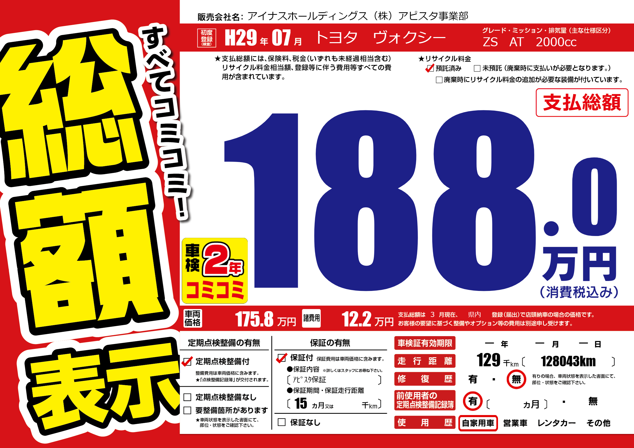 | 走行キロ | 12.9万km | 初年度登録 | H29年07月 |
