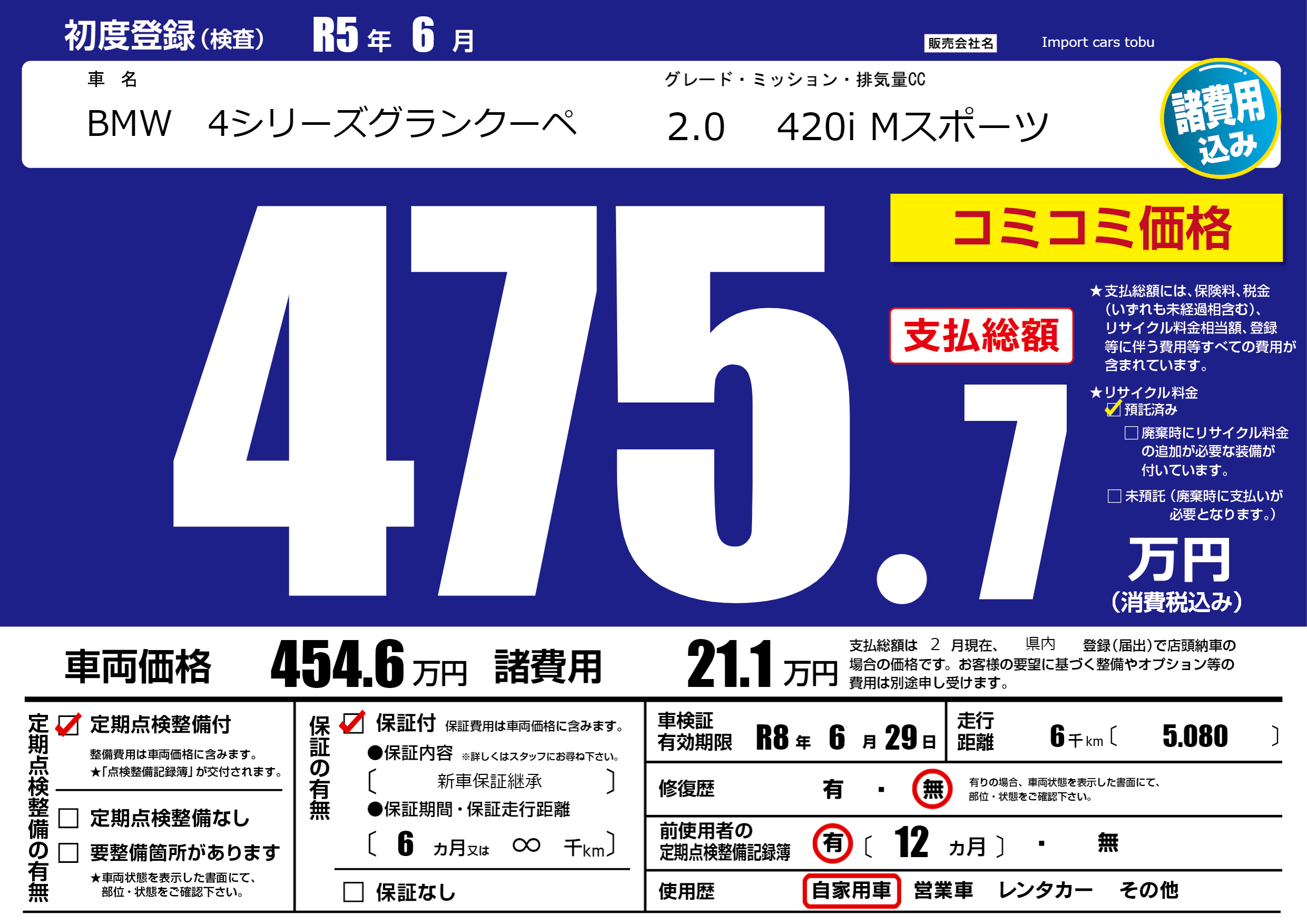 保証付き 保証内容( 新車保証継承) 6ヶ月または(∞)千kmまで |