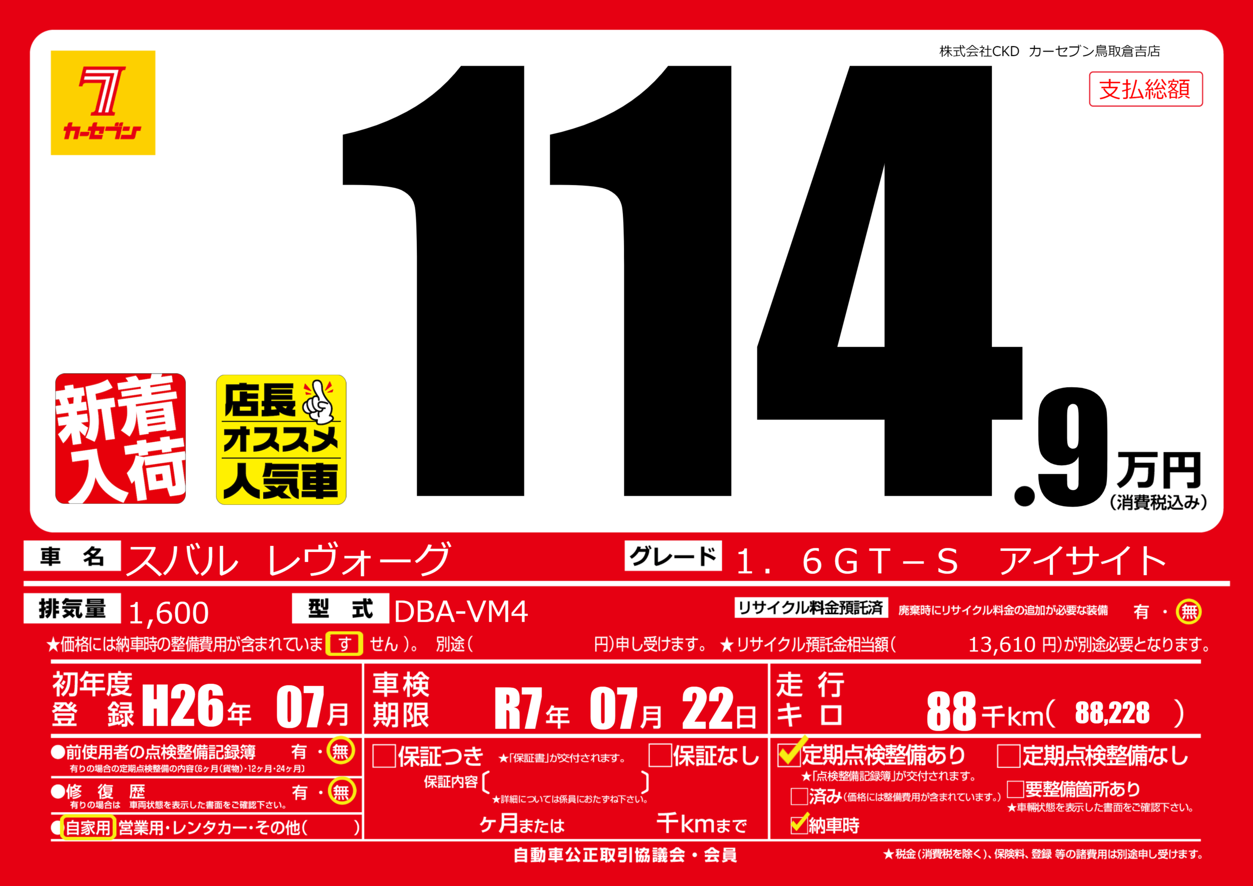| 車名 | スバル レヴォーグ | グレード ミッション 排気量 |