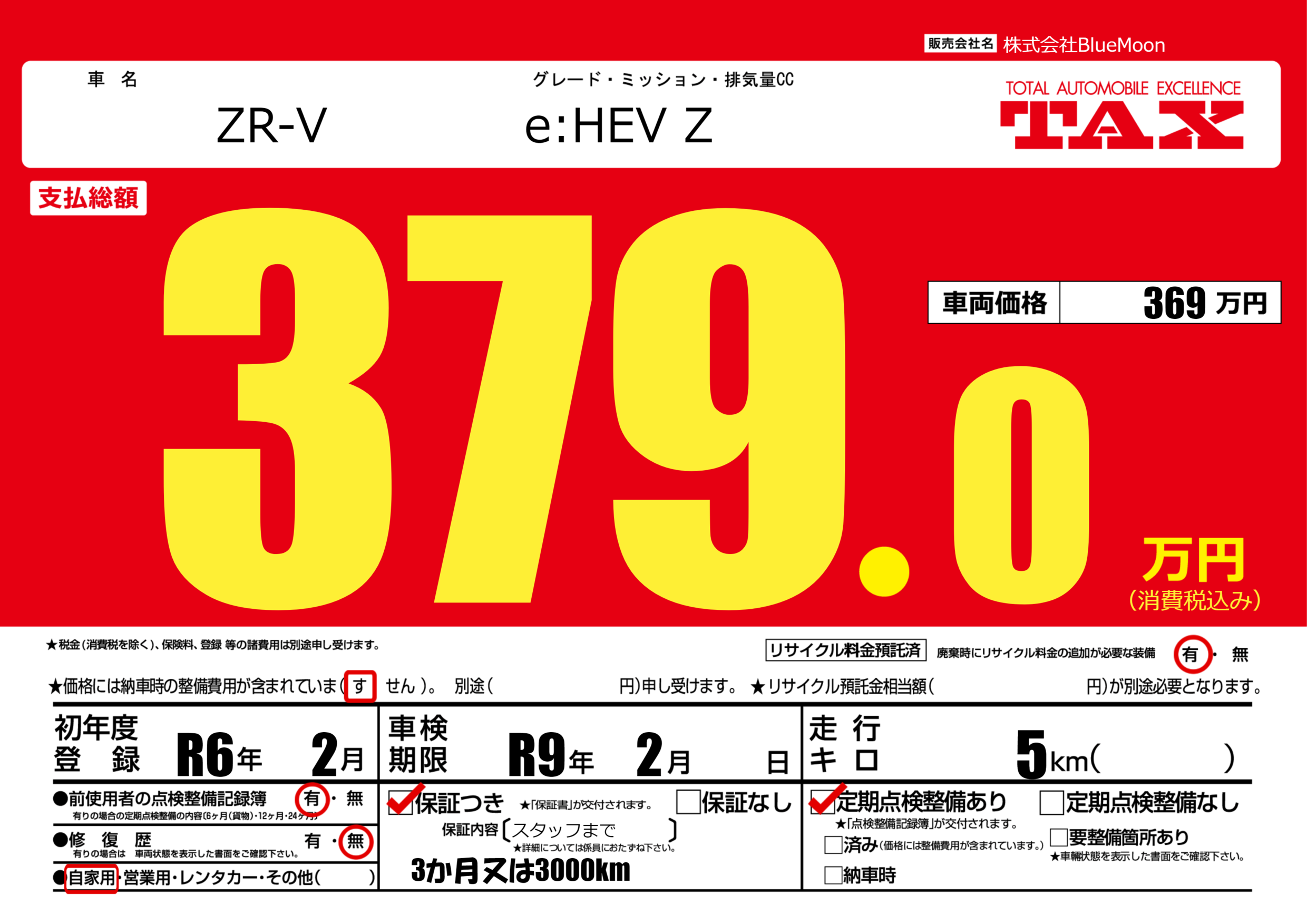 | 車名 | ZR-V | グレード ミッション 排気量 |