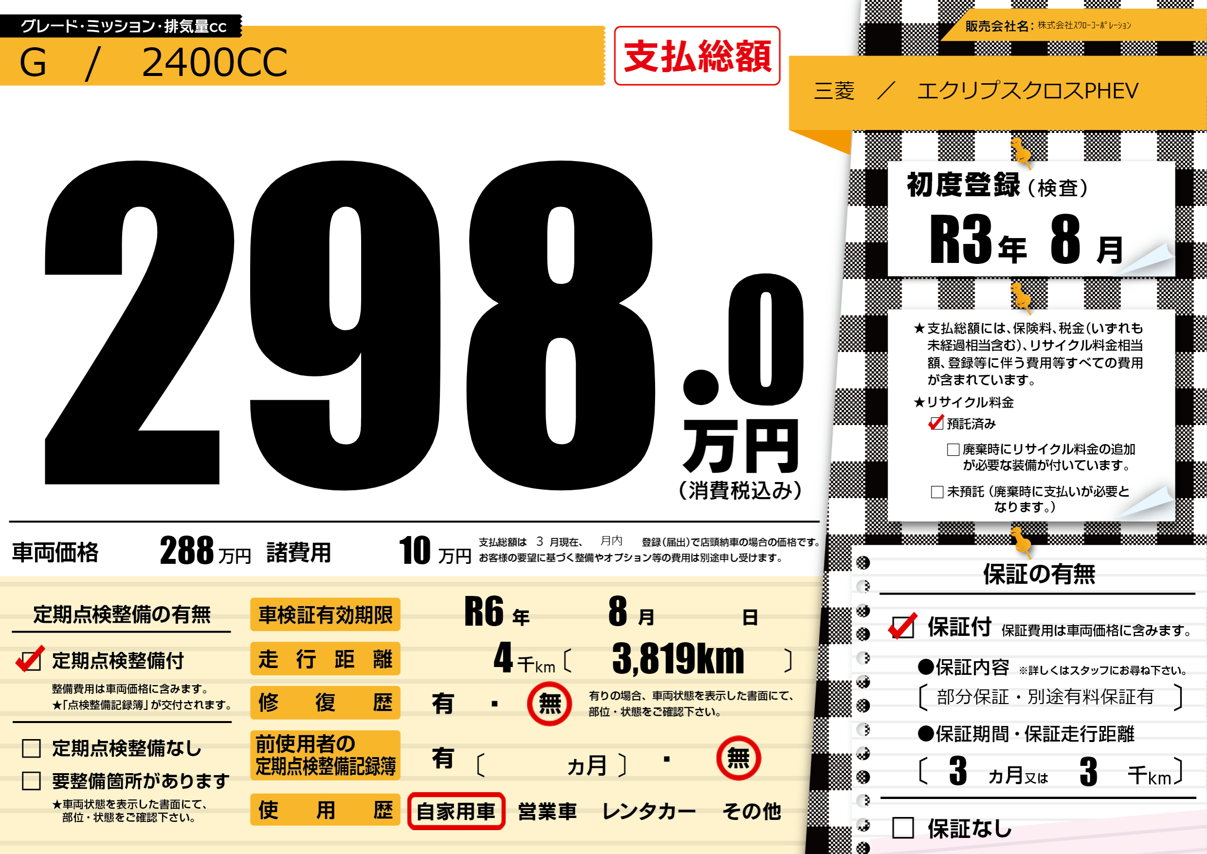 | 車名 | 三菱 / エクリプスクロスPHEV | グレード ミッション 排気量 |