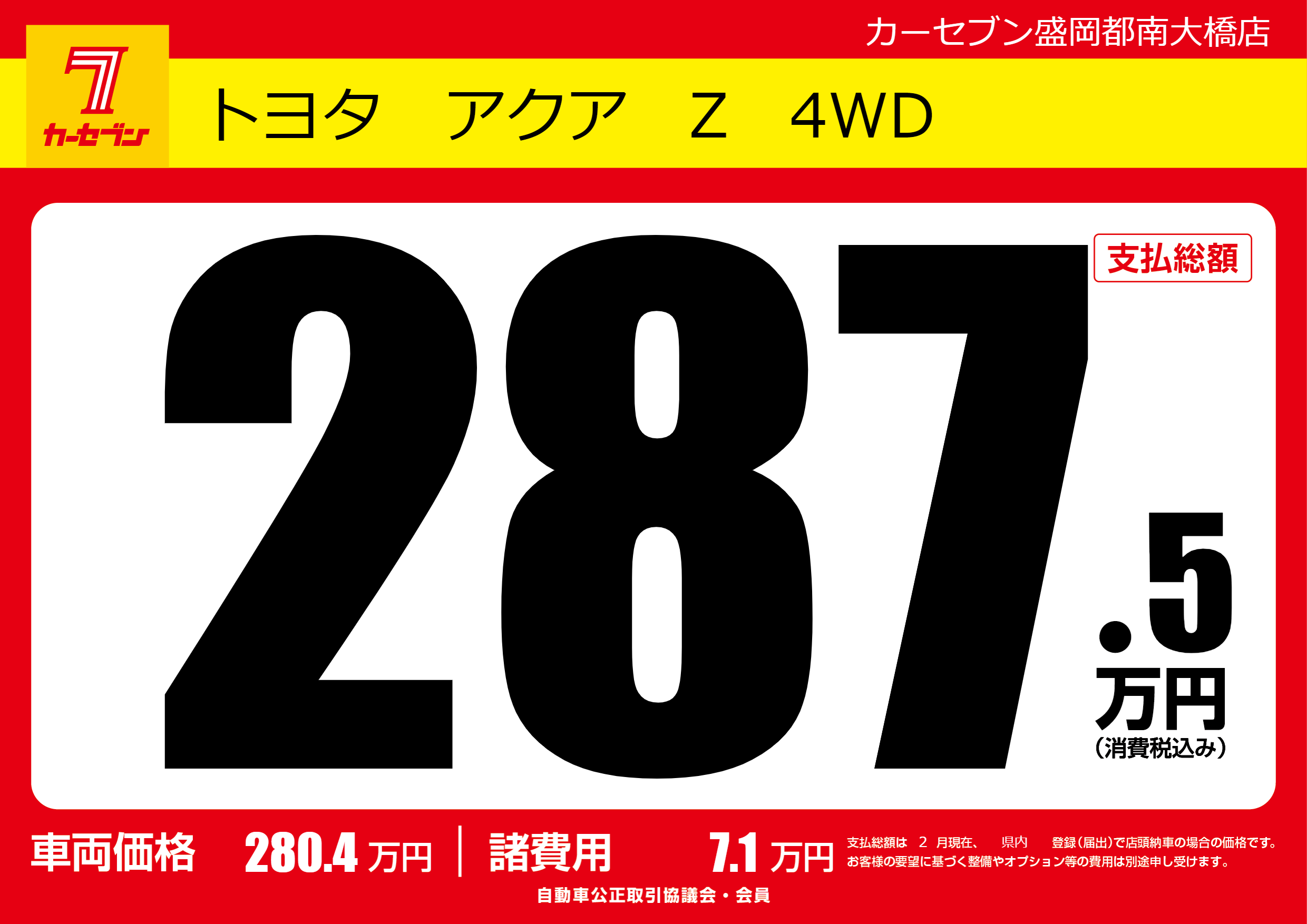 | 車名 | トヨタ アクア Z 4WD | グレード ミッション 排気量 |