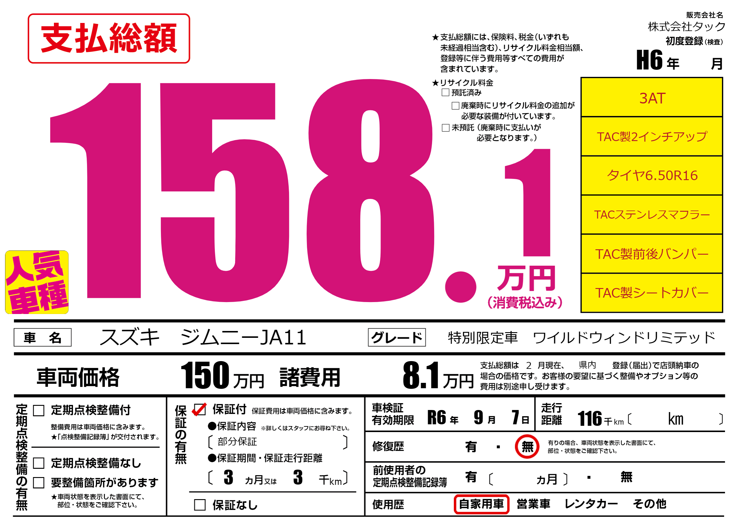 | 車名 | スズキ ジムニーJA11 | グレード ミッション 排気量 |