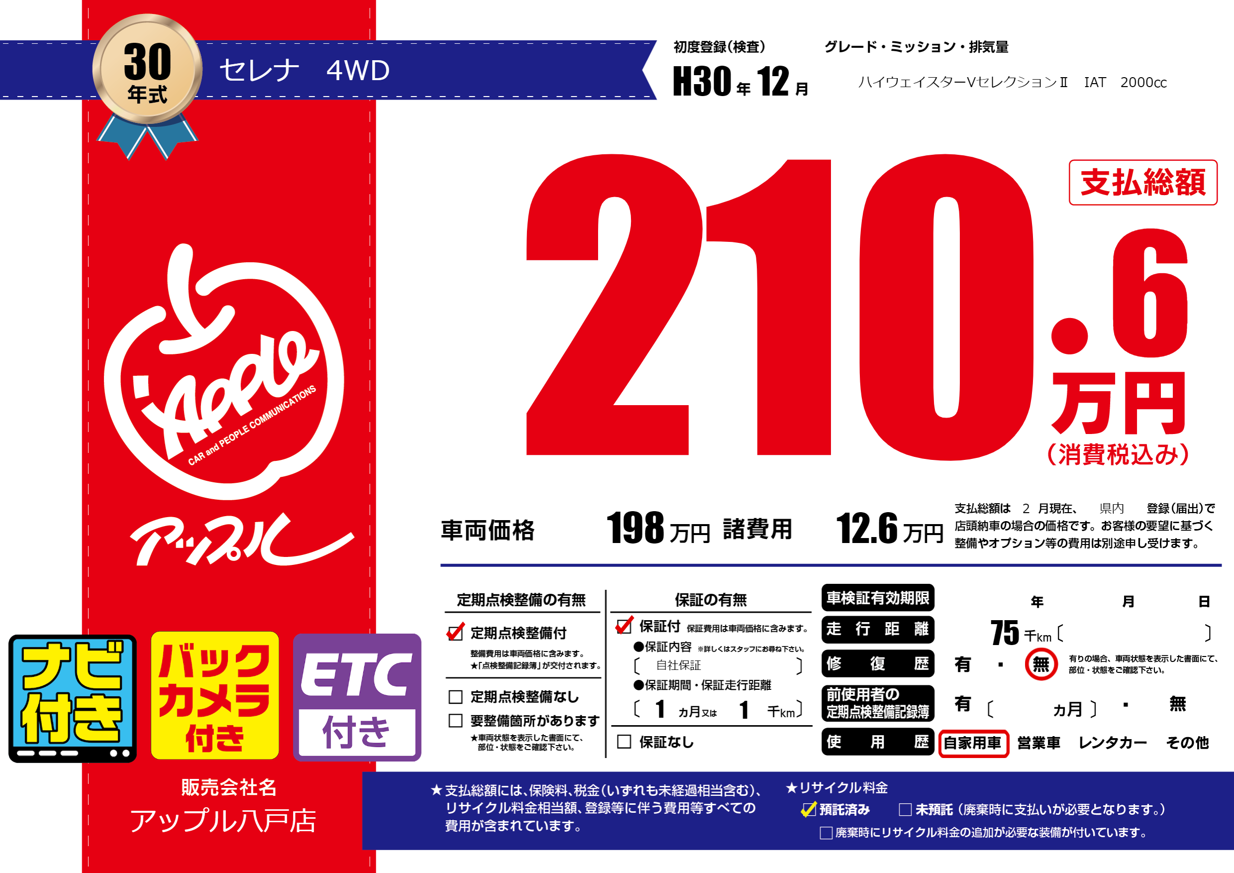 | 車名 | セレナ 4WD | グレード ミッション 排気量 |
