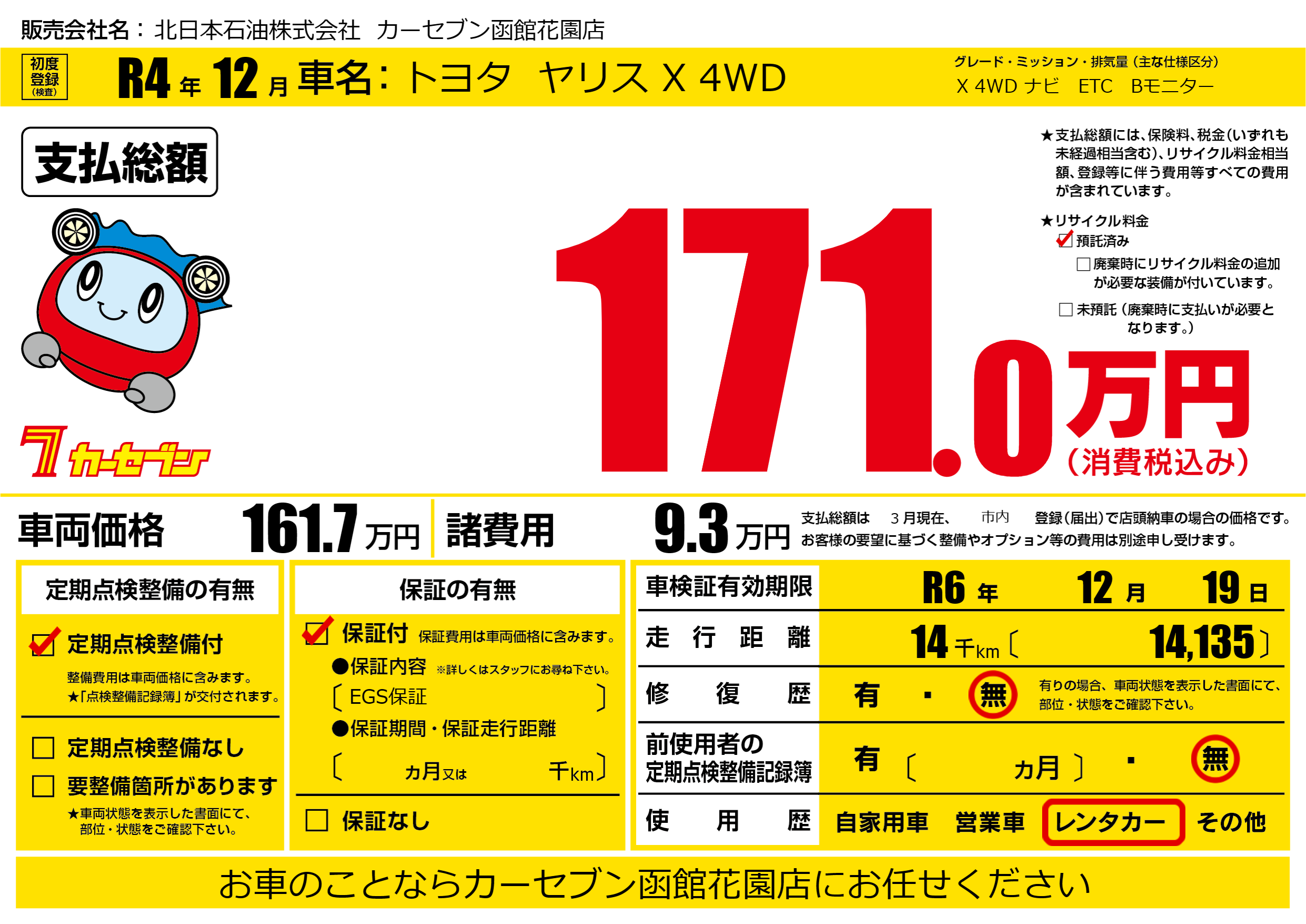 | 車名 | トヨタ ヤリス X 4WD | グレード ミッション 排気量 |
