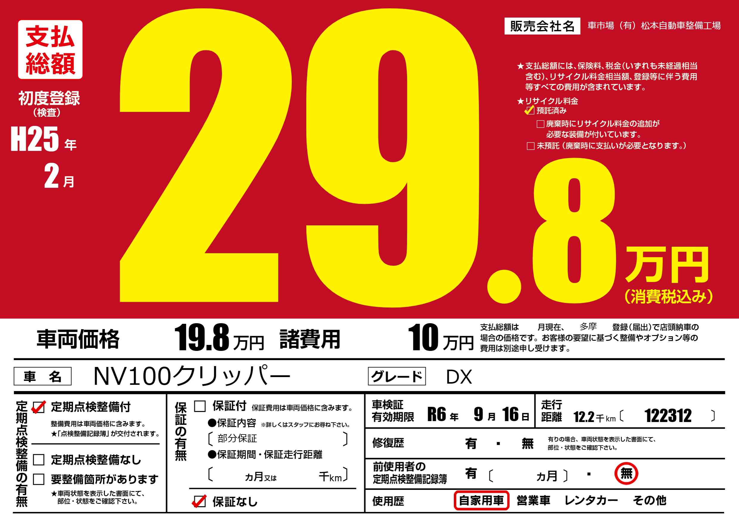 | 車名 | NV100クリッパー | グレード ミッション 排気量 |