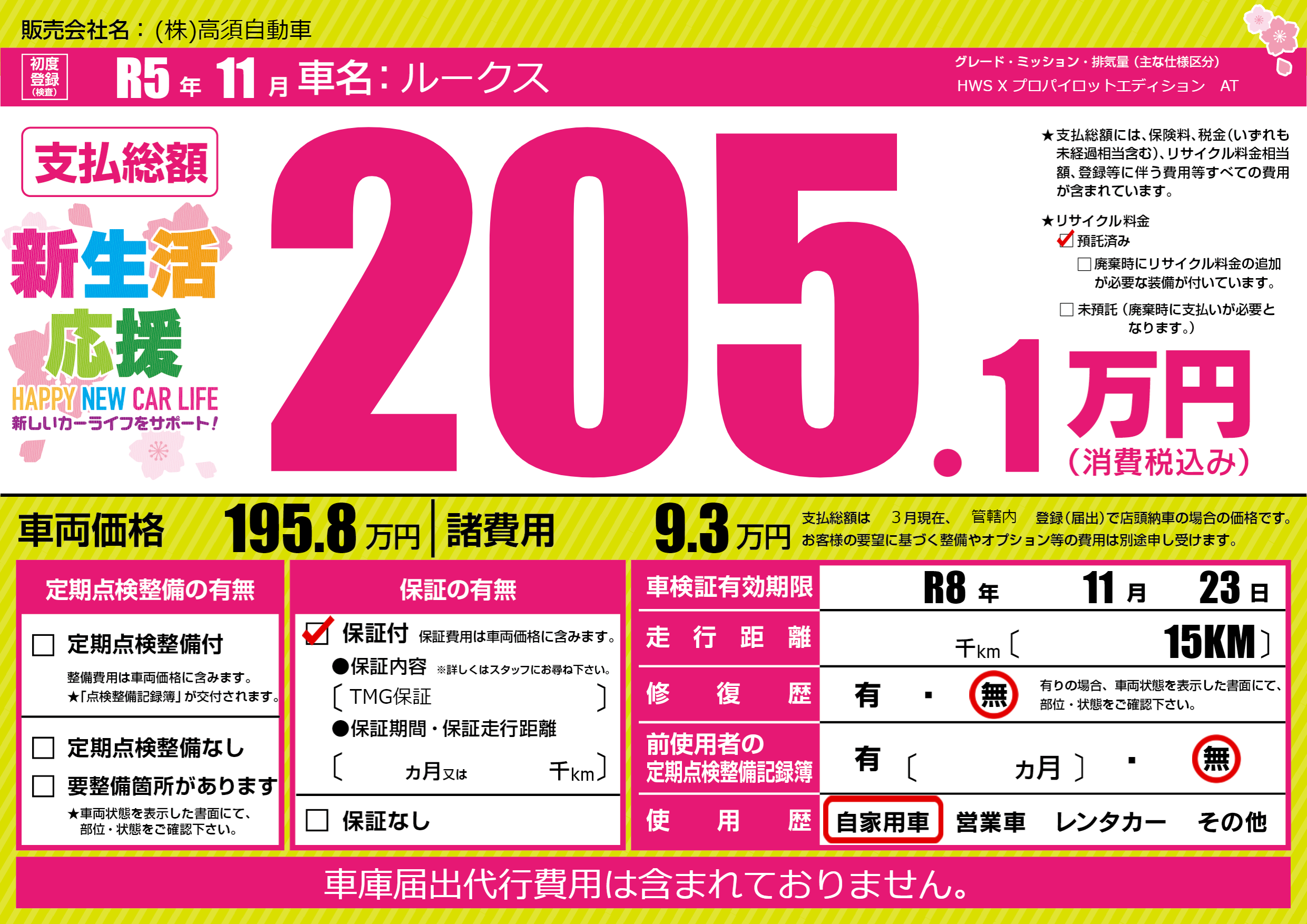 | 走行キロ | - | 初年度登録 | R5年11月 |