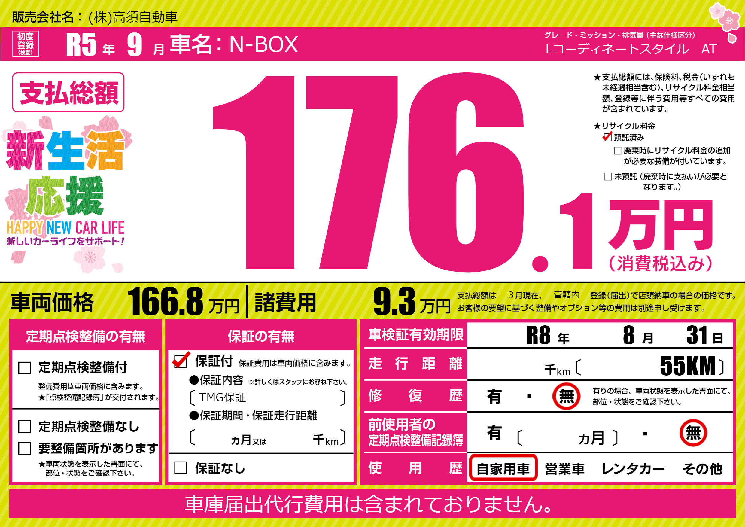 保証付き 保証内容(TMG保証) ---ヶ月または()千kmまで |