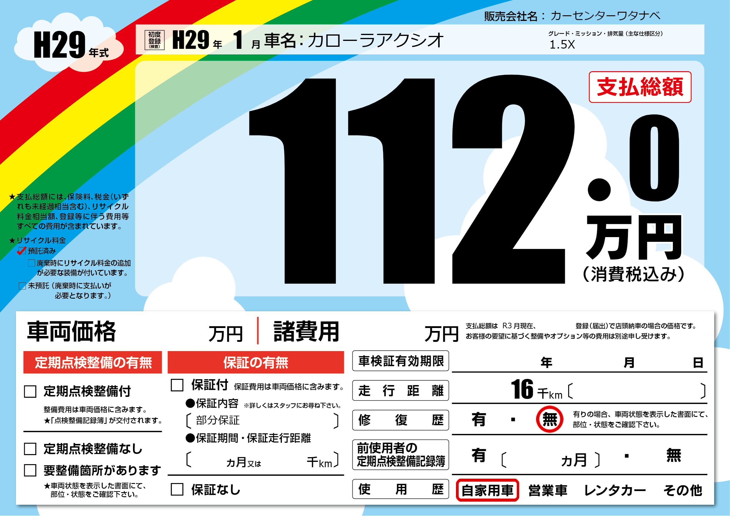 | 車名 | カローラアクシオ | グレード ミッション 排気量 |