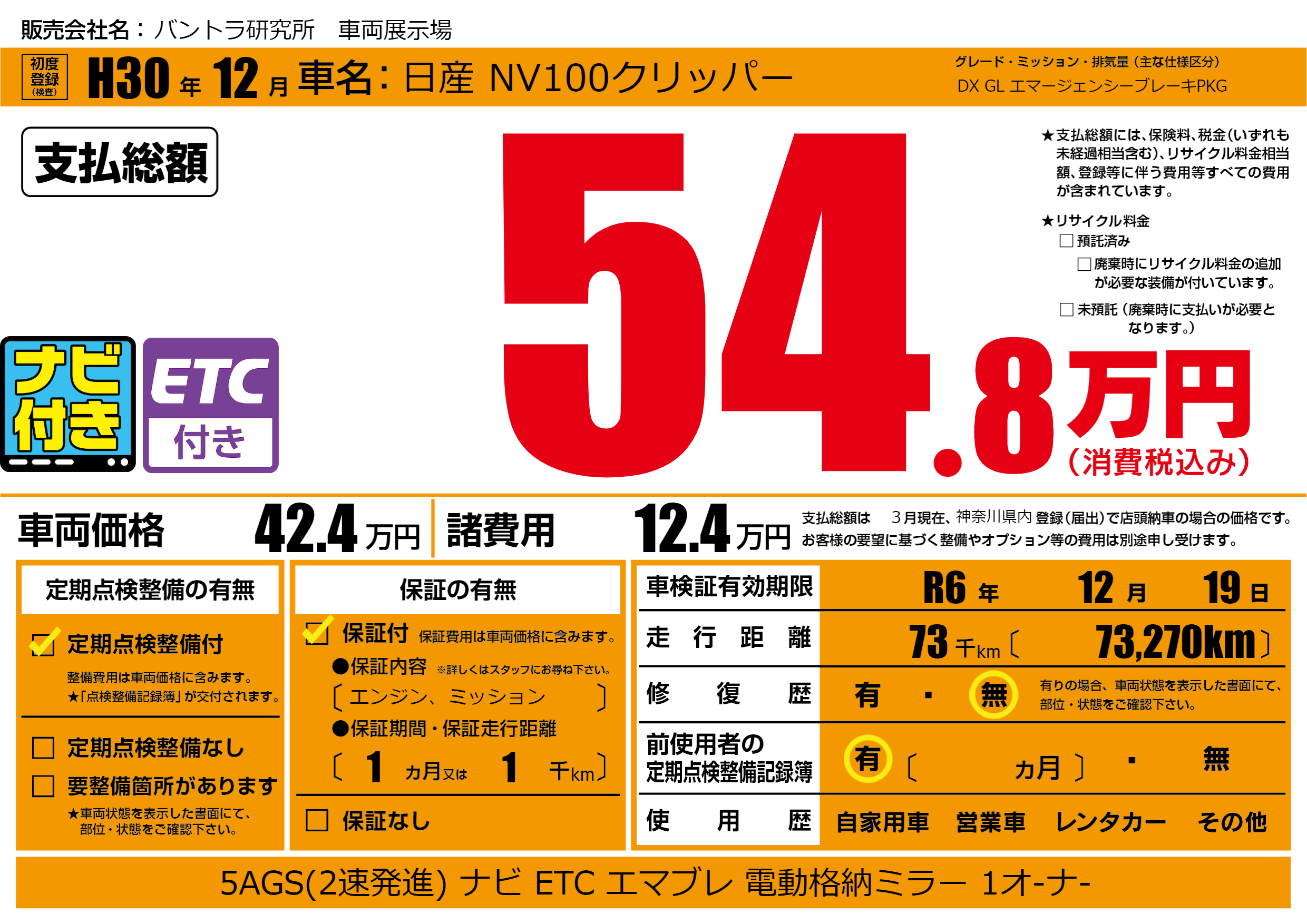 | 車検制限 | R6年 12月 19日 | ||