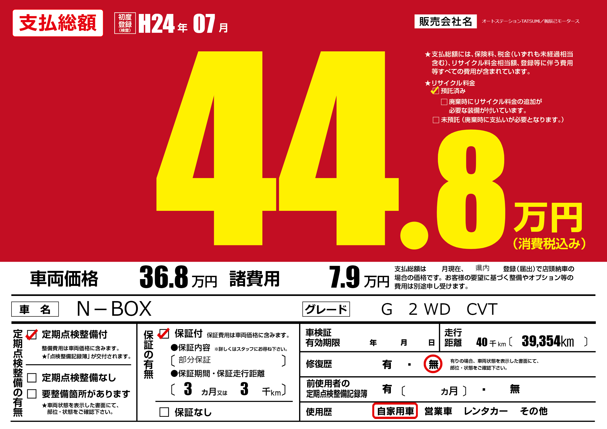| 走行キロ | 4万km | 初年度登録 | H24年07月 |
