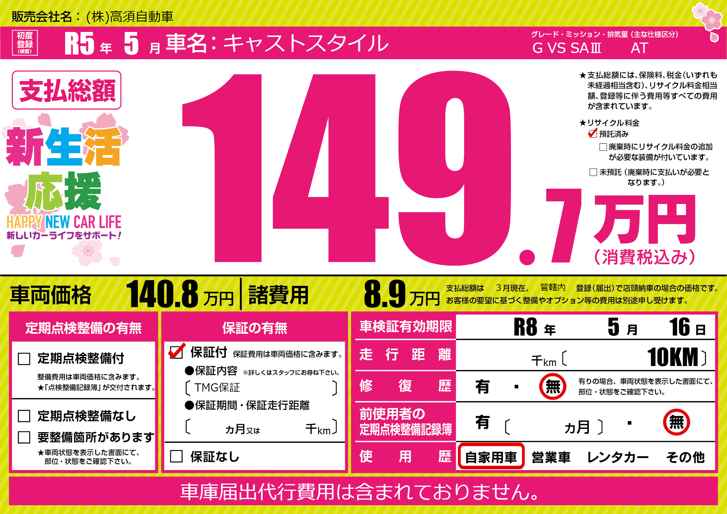 保証付き 保証内容(TMG保証) ---ヶ月または()千kmまで |