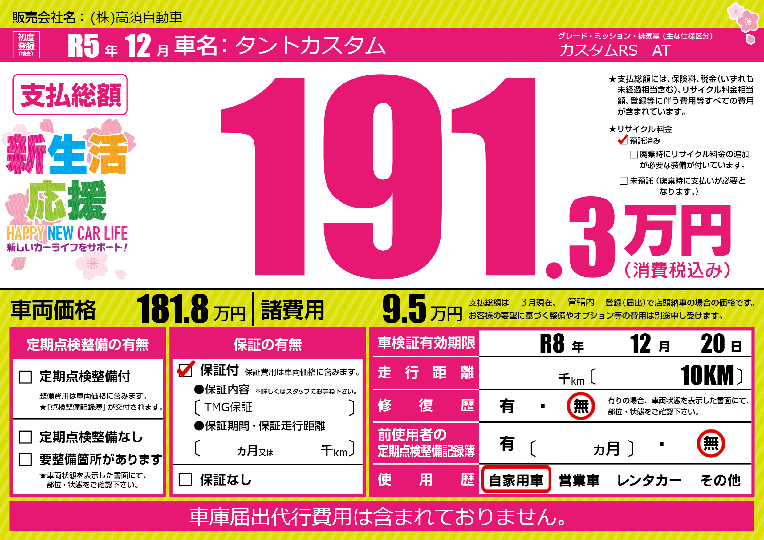 保証付き 保証内容(TMG保証) ---ヶ月または()千kmまで |