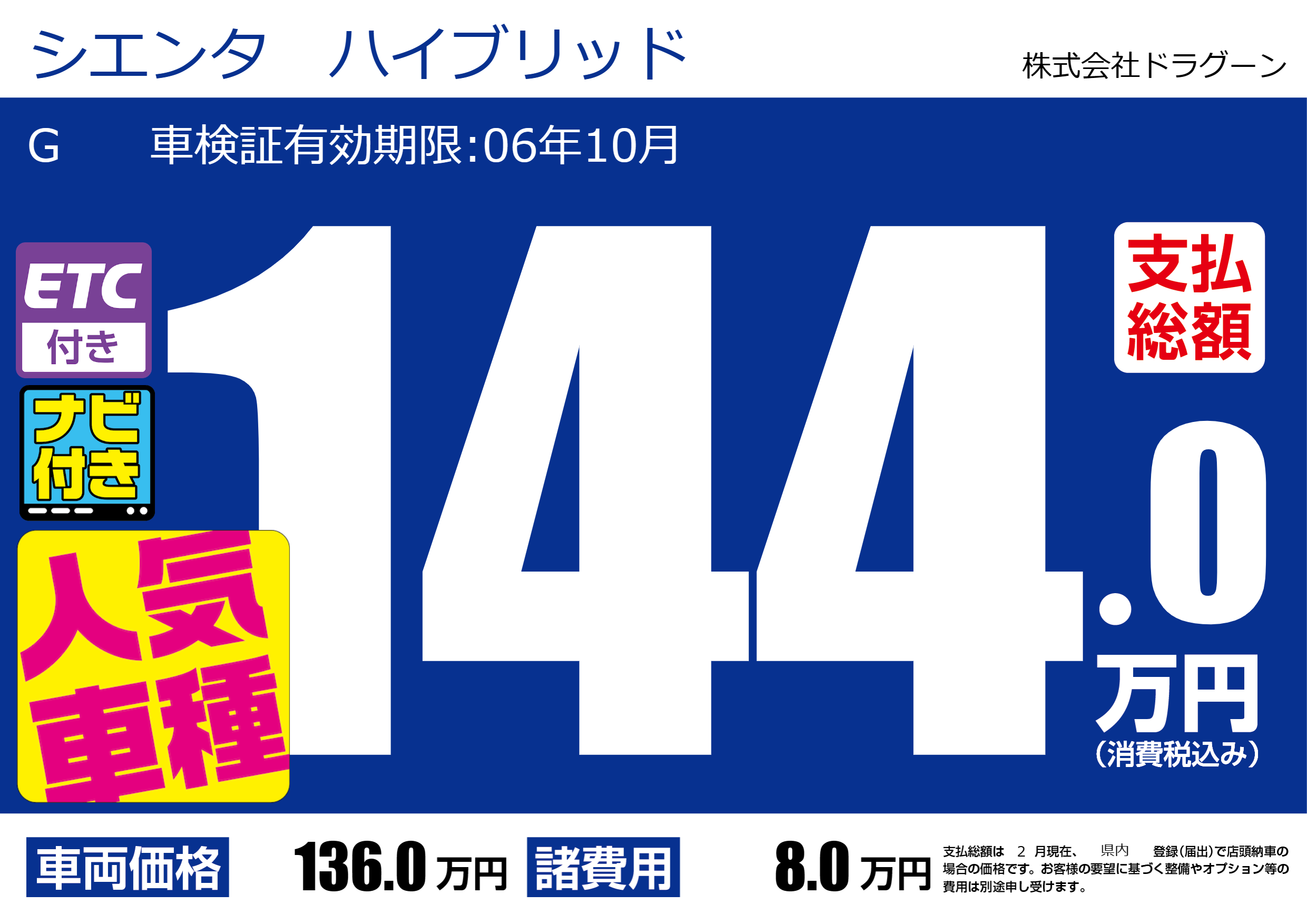 | 車名 | シエンタ ハイブリッド | グレード ミッション 排気量 |