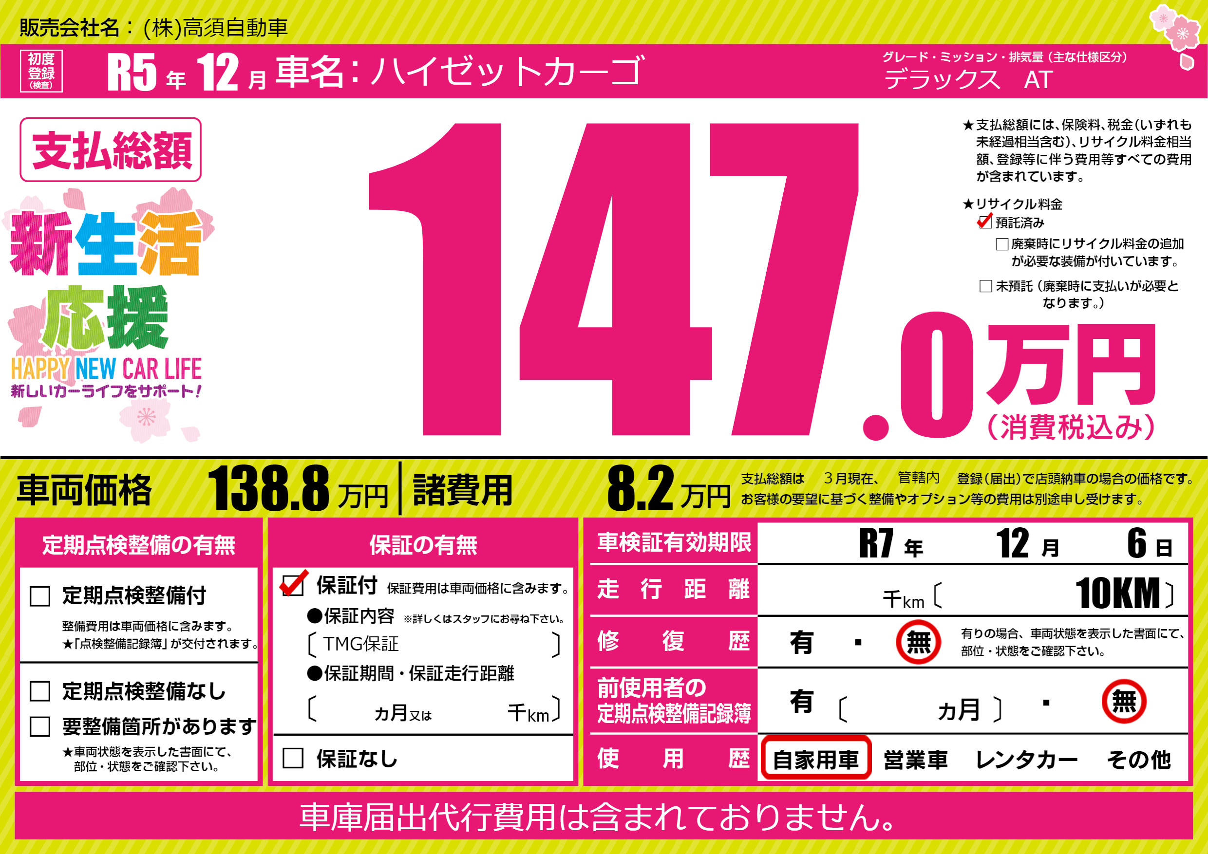 | 車名 | ハイゼットカーゴ | グレード ミッション 排気量 |