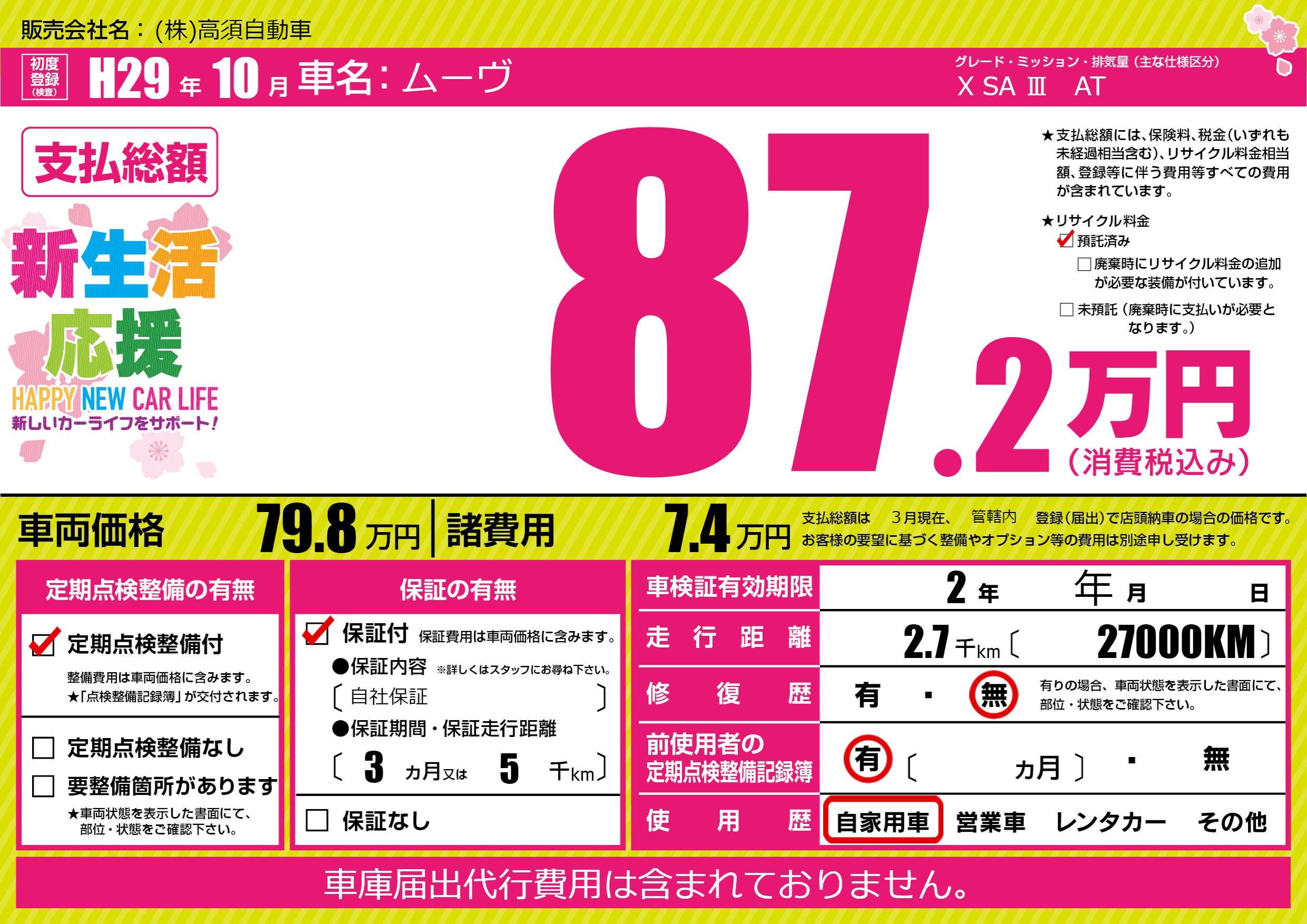 保証付き 保証内容(自社保証) 3ヶ月または5千km |