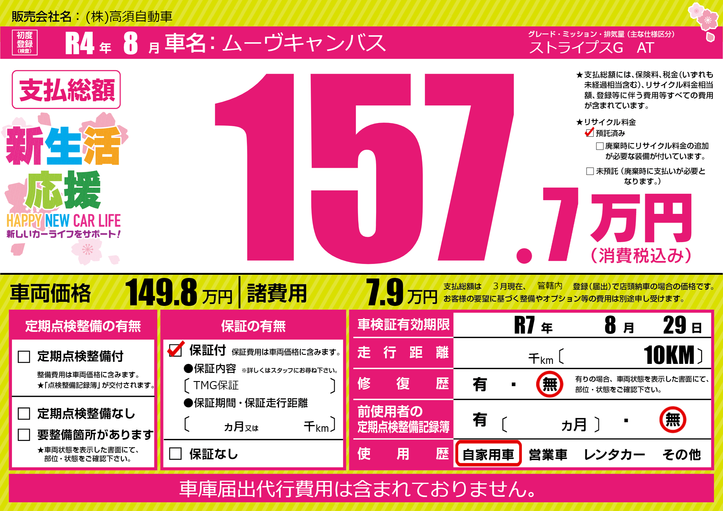 | 走行キロ | - | 初年度登録 | R4年8月 |
