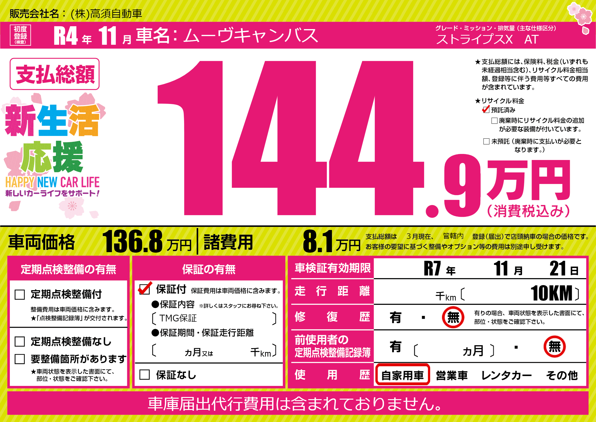 保証付き 保証内容(TMG保証) ---ヶ月または()千kmまで |