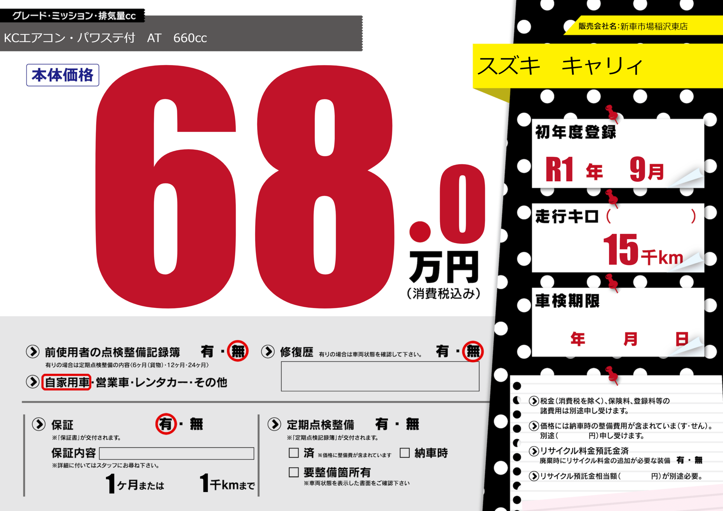 | 車名 | スズキ キャリィ | グレード ミッション 排気量 |