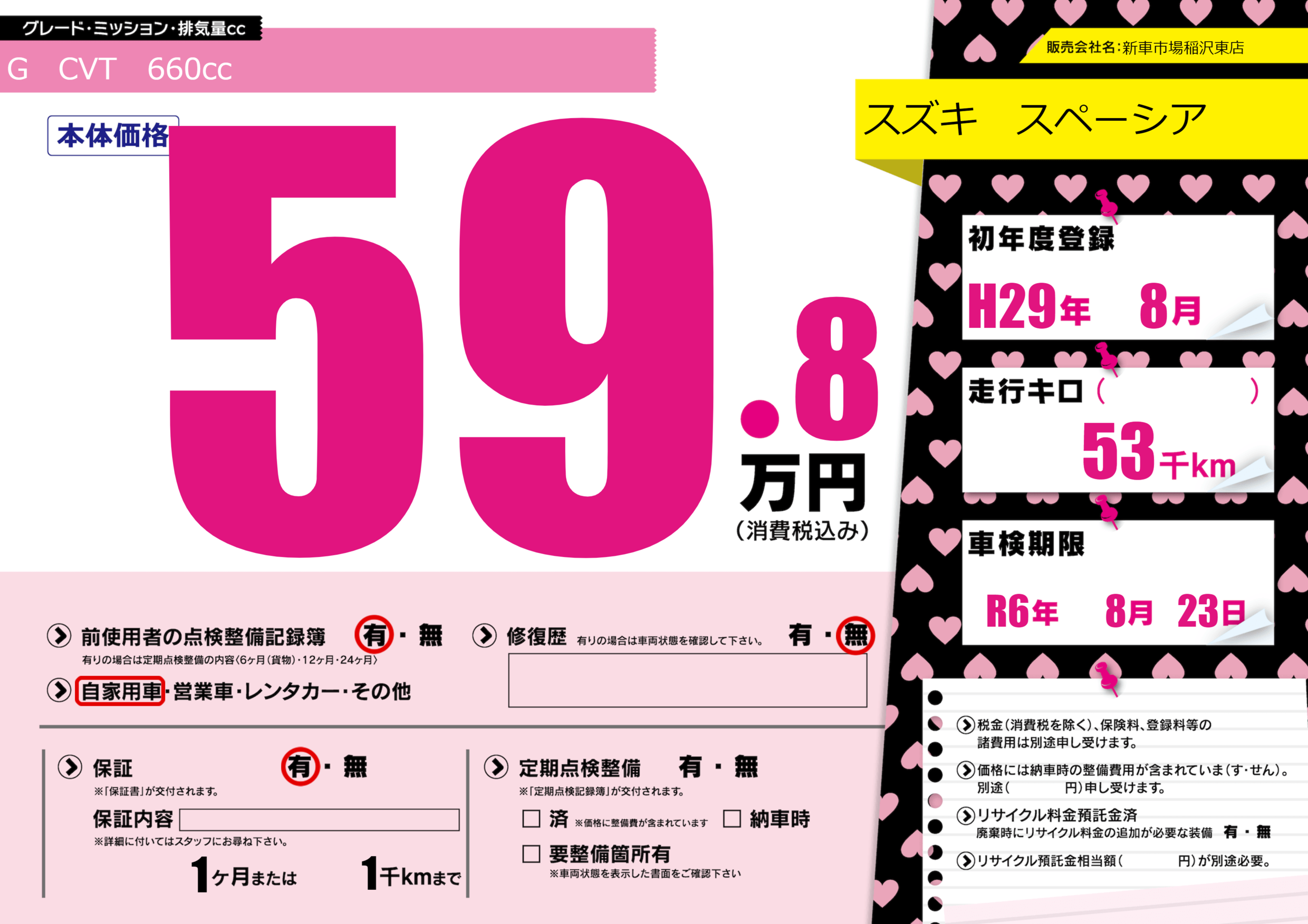 | 車名 | スズキ スペーシア | グレード ミッション 排気量 |