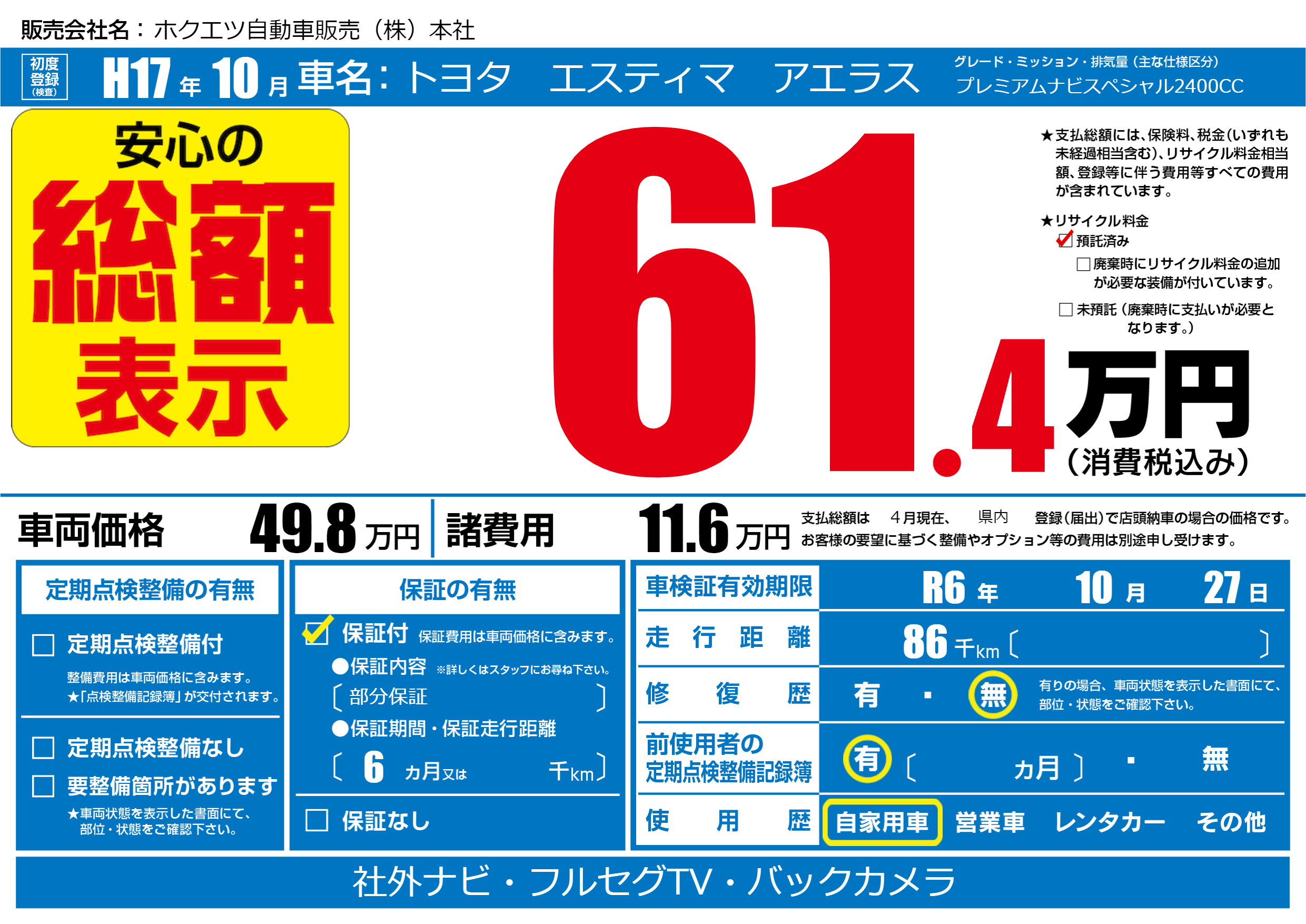 | 走行キロ | 8.6万km | 初年度登録 | H17年10月 |