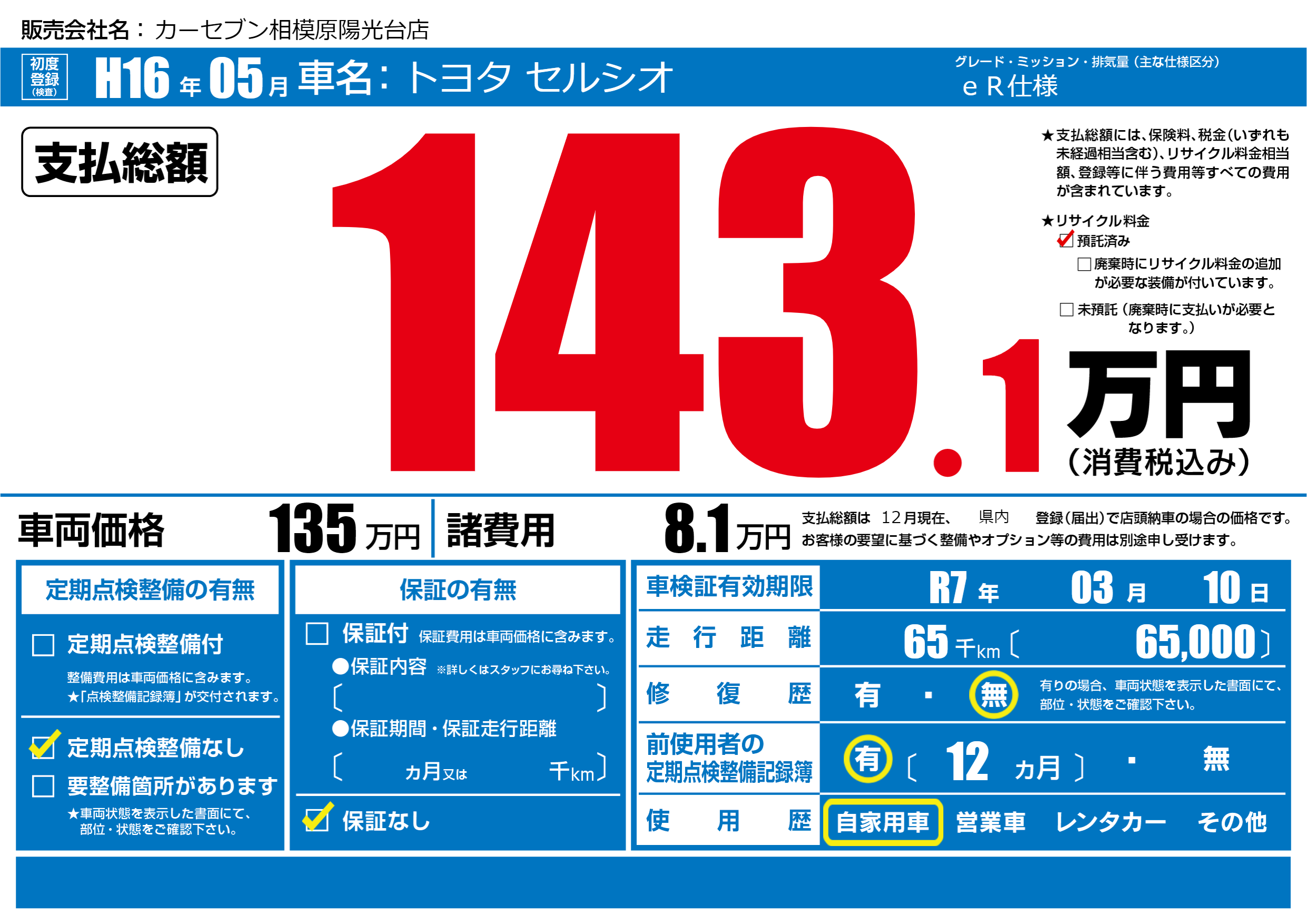 | 走行キロ | 6.5万km | 初年度登録 | H16年05月 |