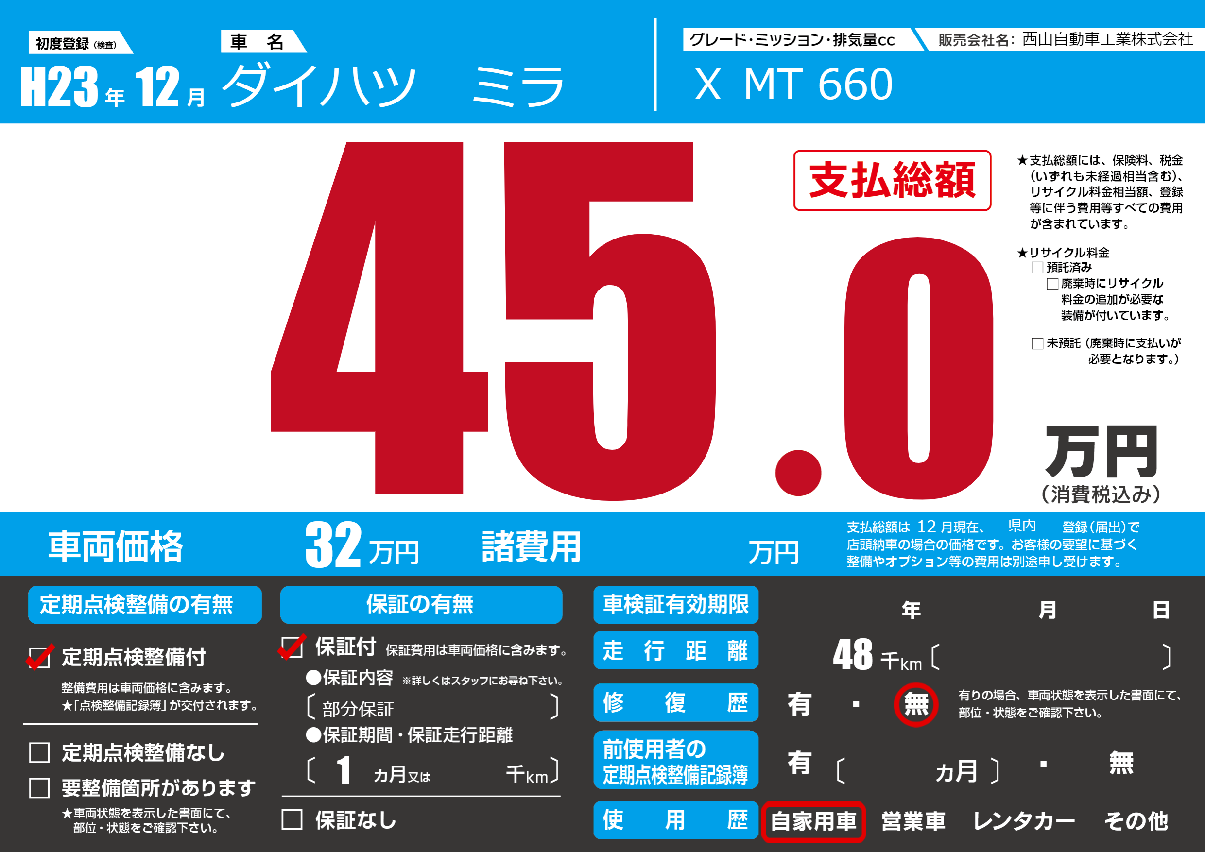 | 走行キロ | 4.8万km | 初年度登録 | H23年12月 |