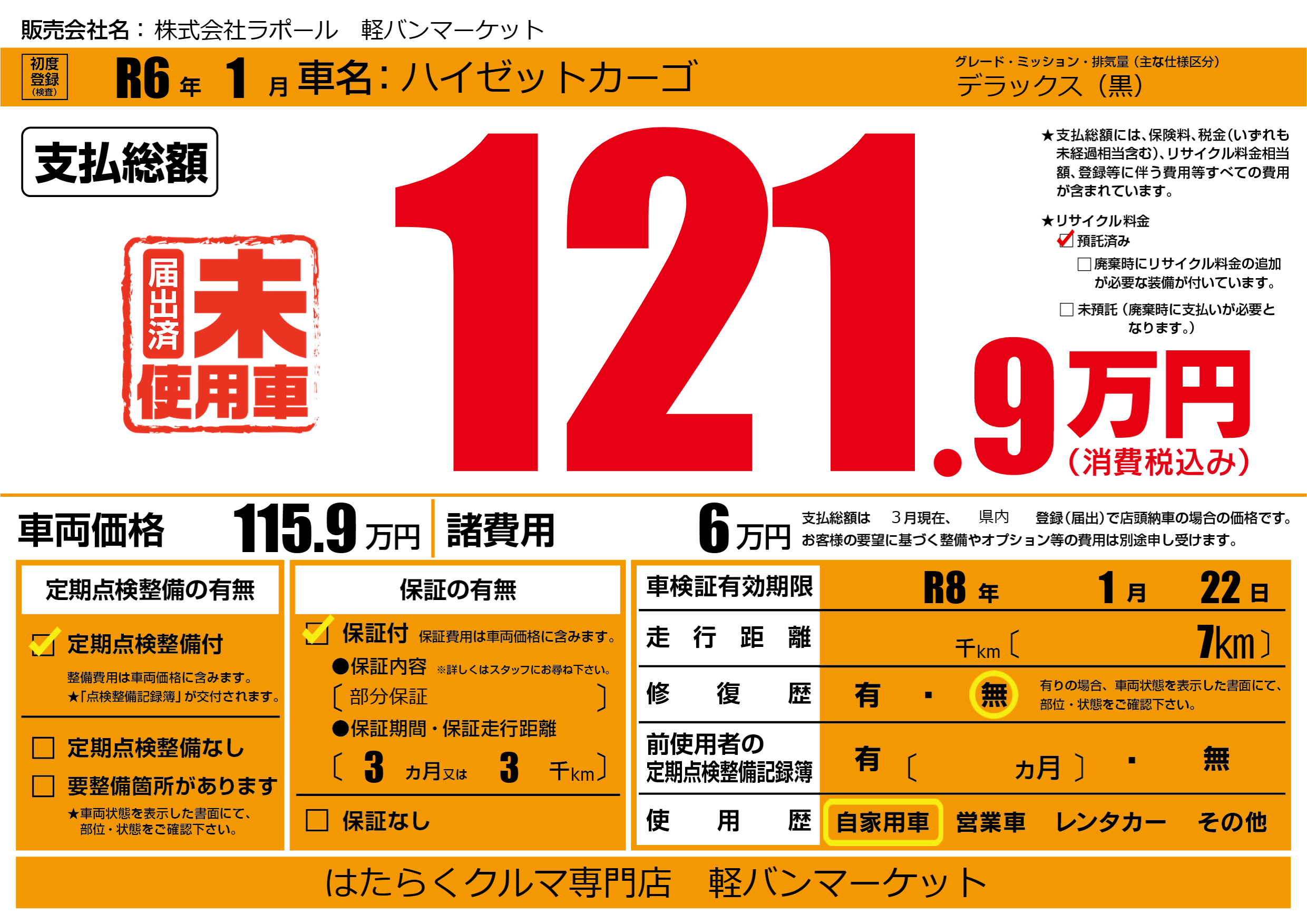 | 車名 | ハイゼットカーゴ | グレード ミッション 排気量 |