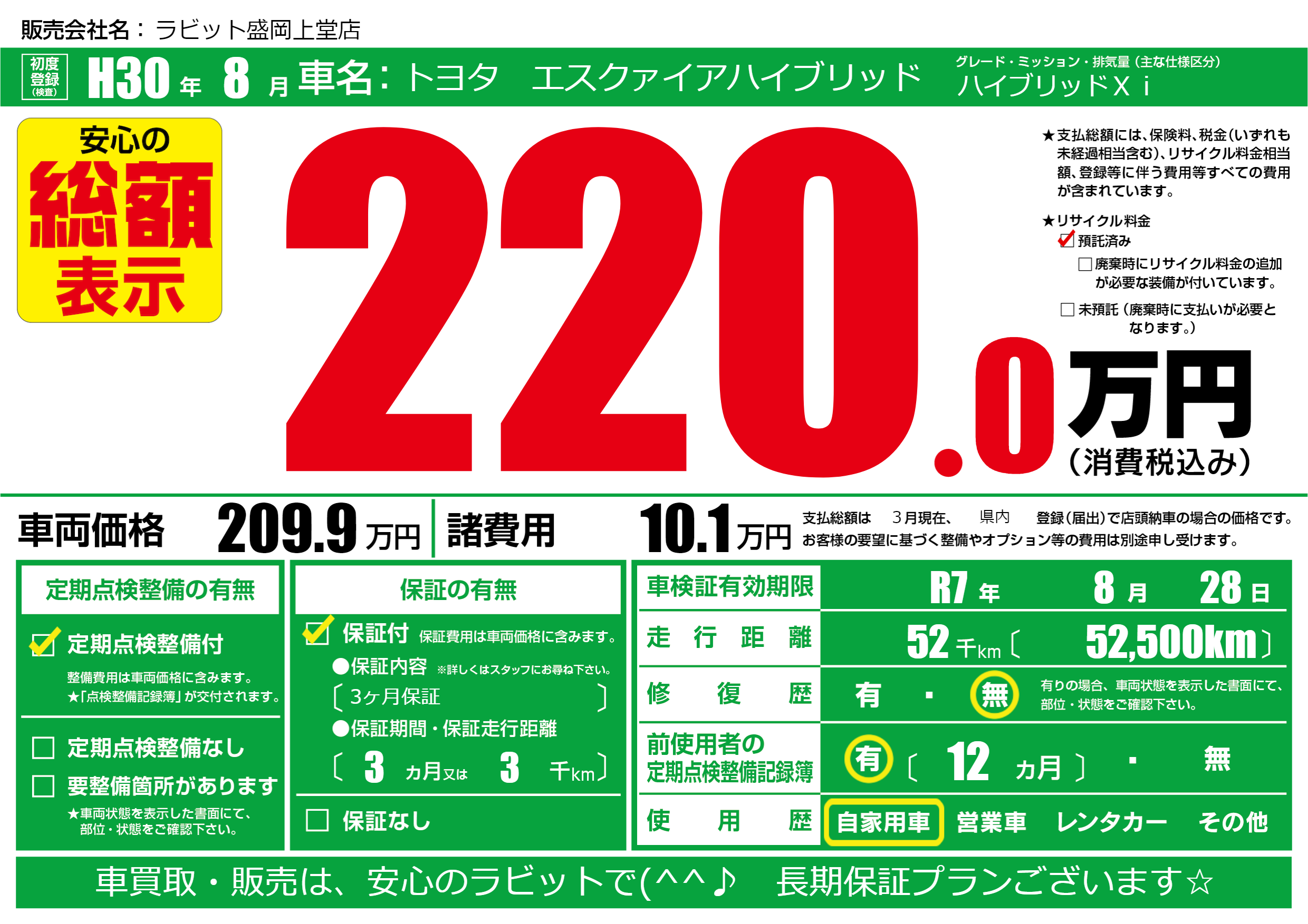 | 走行キロ | 5.2万km | 初年度登録 | H30年8月 |