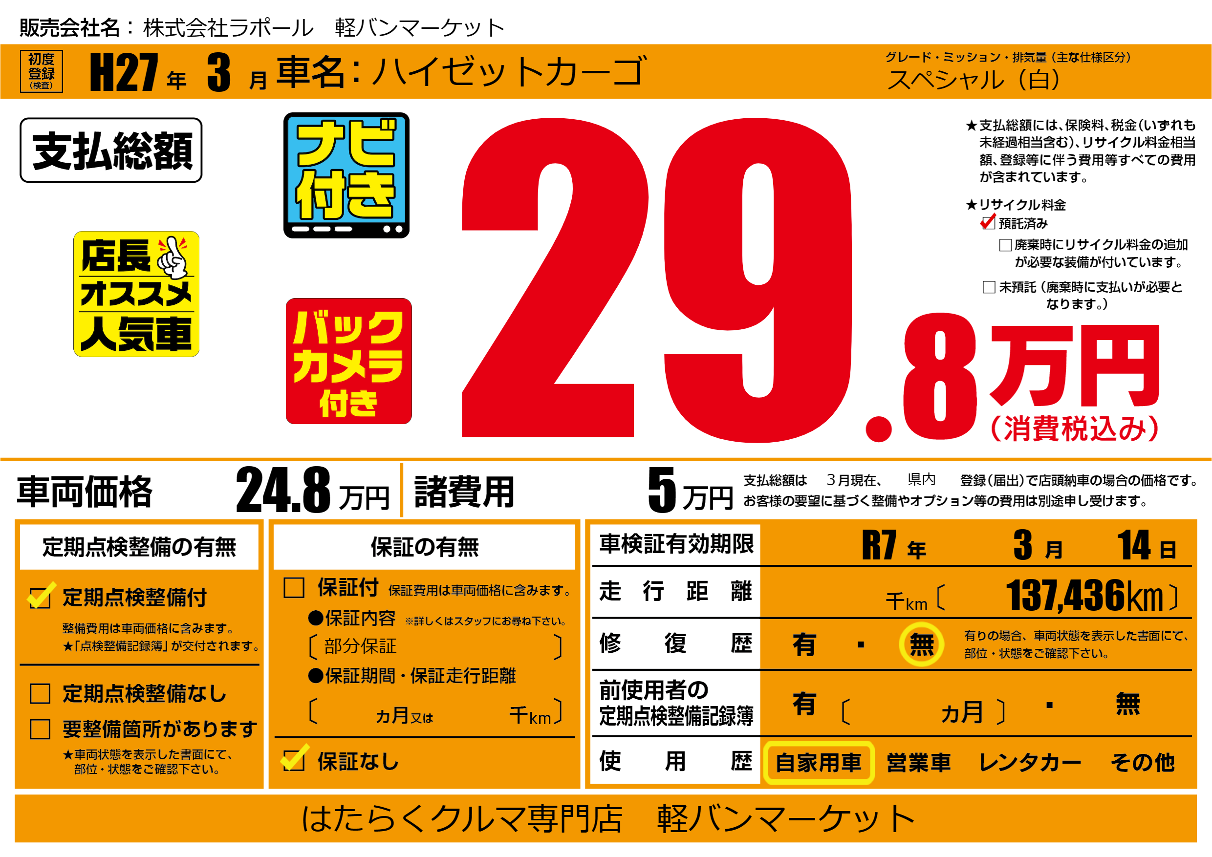 | 車検制限 | R7年 3月 14日 | ||