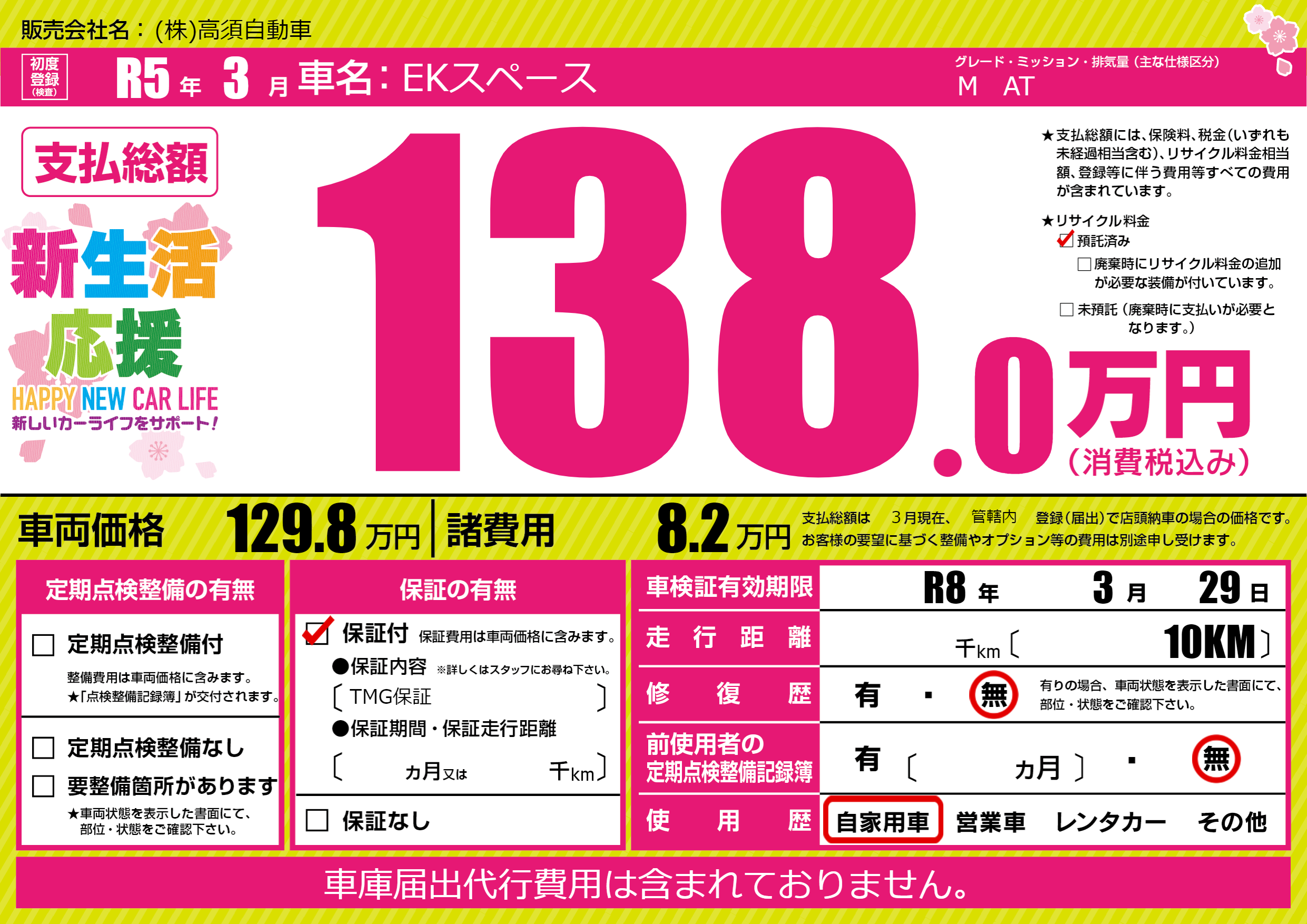 | 車名 | EKスペース | グレード ミッション 排気量 |